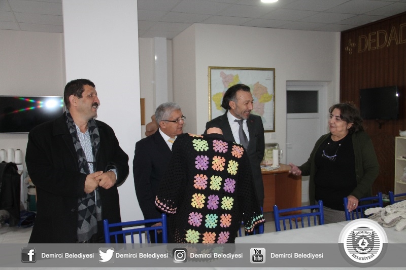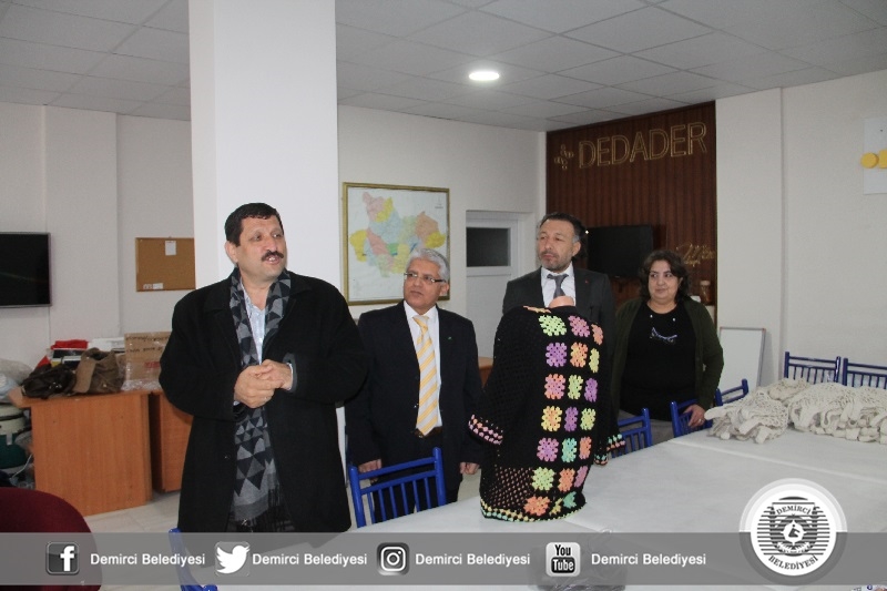 Belediye Başkanı Selami Selçuk'ta, file ören kadınları İlçe Milli Eğitim Şube Müdürü Ünal Özcan ve Halk Eğitimi Merkezi Müdürü İsmail Çetinkaya ile birlikte atölyede ziyaret ederek kolaylıklar diledi.