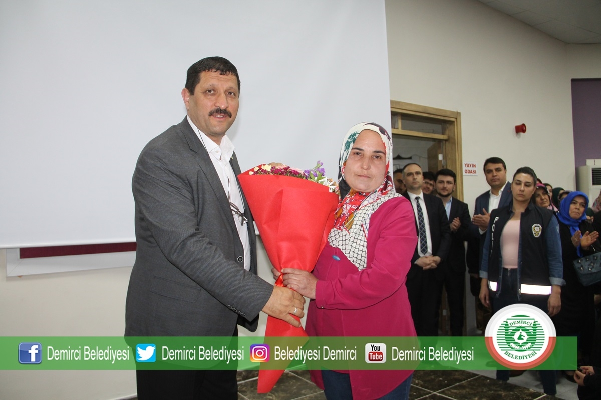 2 işitme engelli çocuğu ve ailesi için yıllardır verdiği hayat mücadelesinden dolayı yılınd kadını seçilen Fatma Demir'e Belediye Başkanı Selami Selçuk tarafından çiçek takdim edilirken, AK Parti Manisa Milletvekili Semra Kaplan Kıvırcık ve Belediye Başkanı Selami Selçuk'un eşi Güzide Selçuk tarafında da çeşitli hediyeler takdim edildi.