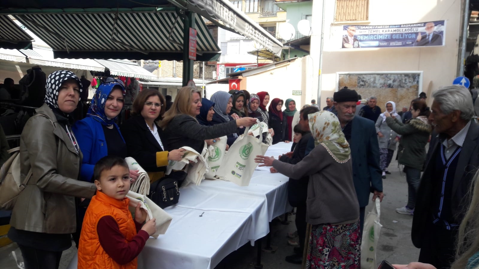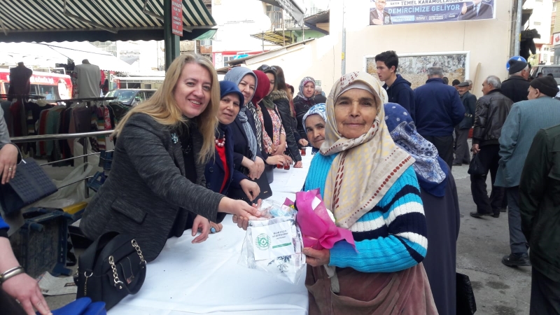 Kurulan stantatta Belediye Başkanı - Cumhur İttifakı AK Parti Demirci Belediye Başkan Adayı Selami Selçuk, eşi Güzide Selçuk, AK Parti ve MHP Kadın Kollarının katılımıyla kadınlara dağıtıldı.