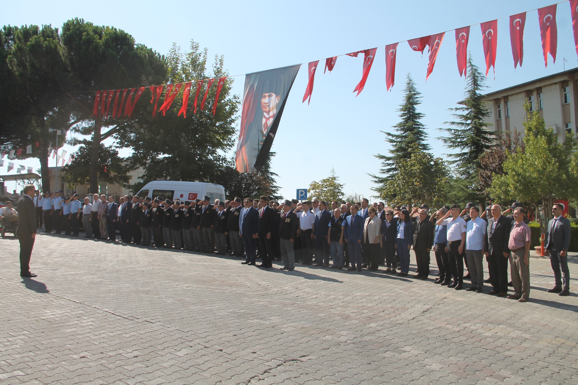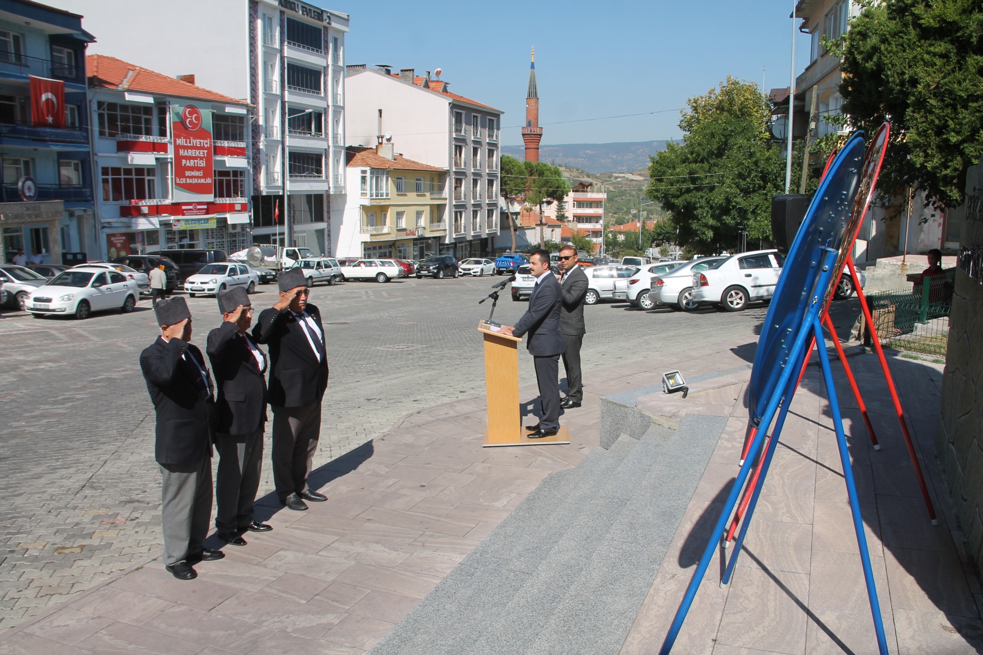 Kaymakamlık makamı, Belediye Başkanlığı ve Muharip Gaziler derneği tarafından Atatürk anıtına çelenklerin sunulmasının ardından saygı duruşu ve İstiklal marşı okundu.