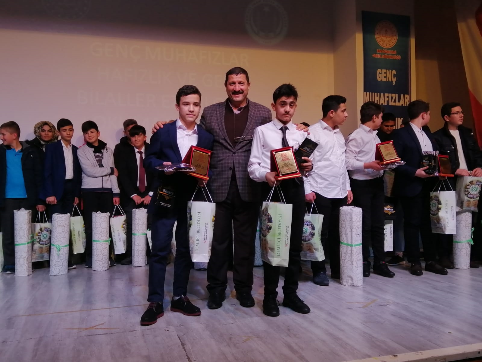 Yarışmanın sonunda Demirci Kaymakamı Adem Kaya ve Belediye Başkanı Selami Selçuk hafızlık ve ezanı güzel yarışmasında dereceye giren öğrencilere hediyelerini takdim etti.