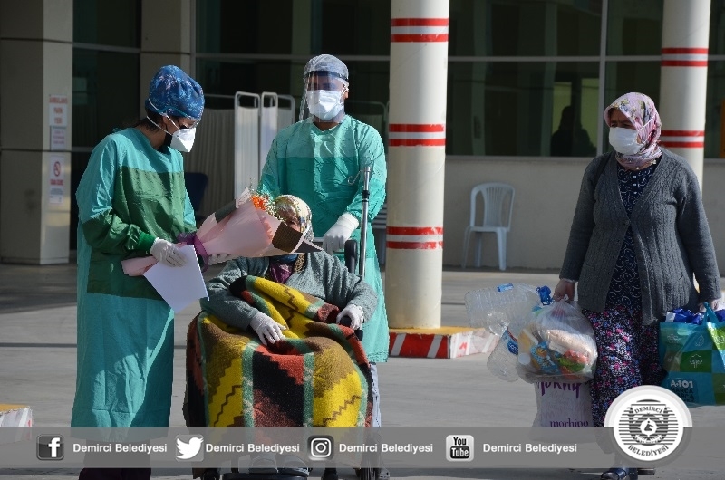 Demirci'de Kovid-19 teşhisi ile hastanede tedavi altına alınan 92 yaşındaki Habibe Dönertaş, sağlığına kavuşarak taburcu edildi.