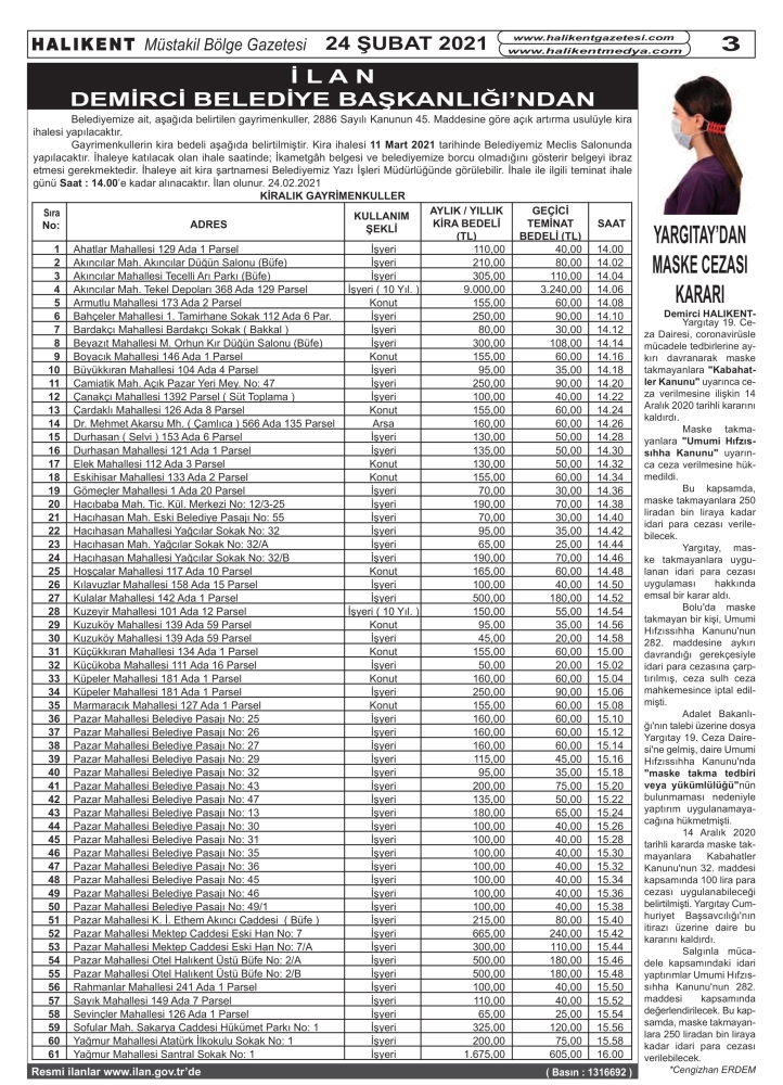 61 GAYRİMENKULÜN KİRA İHALESİ