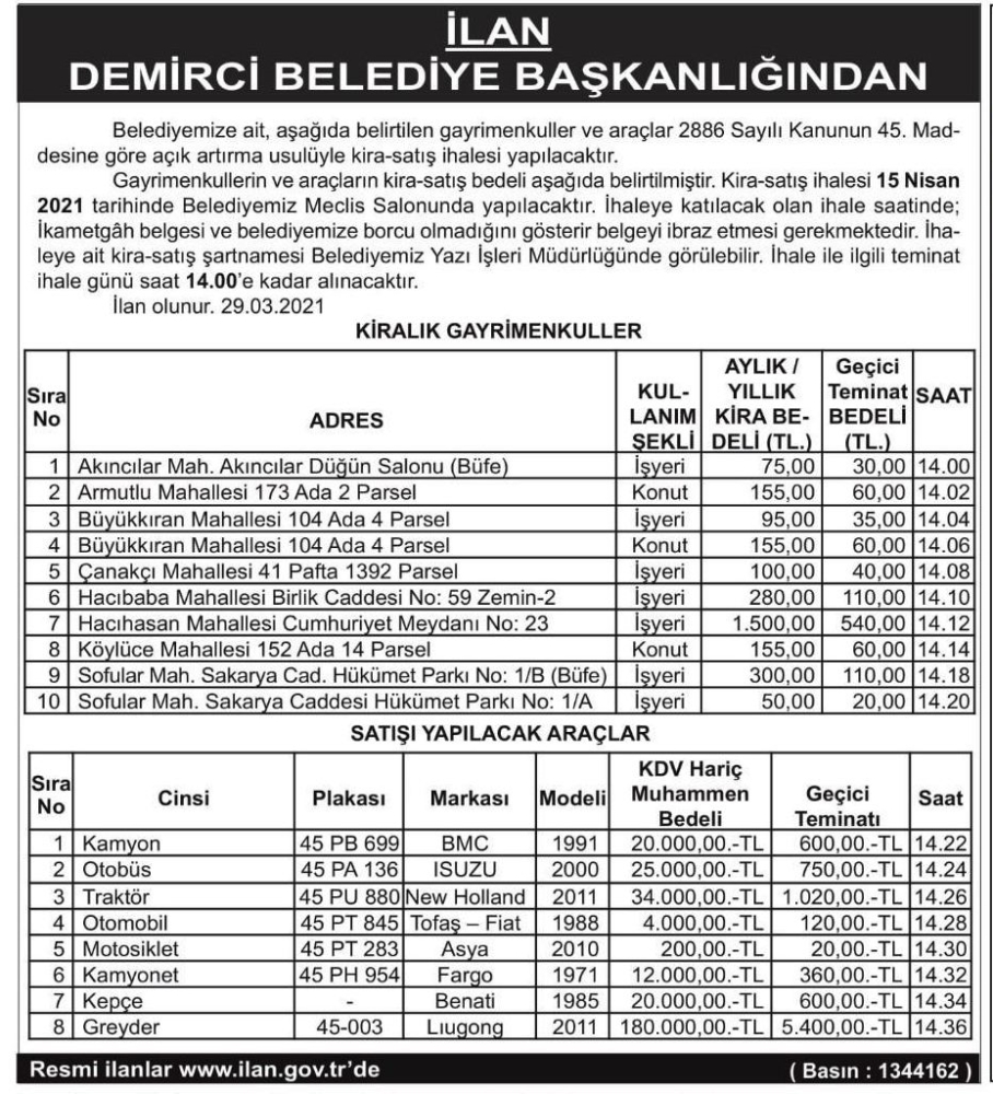 Demirci Belediyesince 2886 sayılı kanun ve 45. maddesi gereğince 15 Nisan 2021 Perşembe günü kira ve satış ihalesi yapılacak.