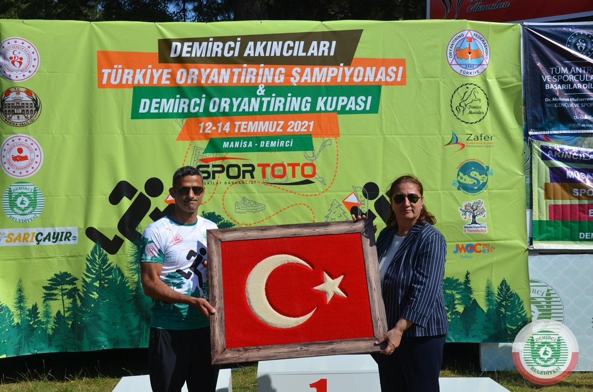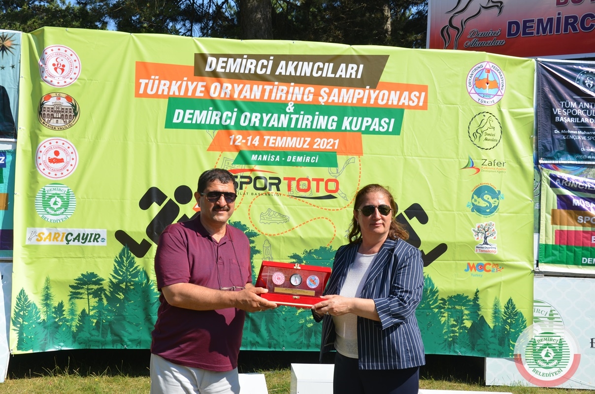 Ödül töreninde Demirci Kaymakamı Adem Kaya, Türkiye Oryantiring Federasyonu Başkanı Hacer Akyüz'e, Ayyıldız motifli el dokuma halı hediye etti.