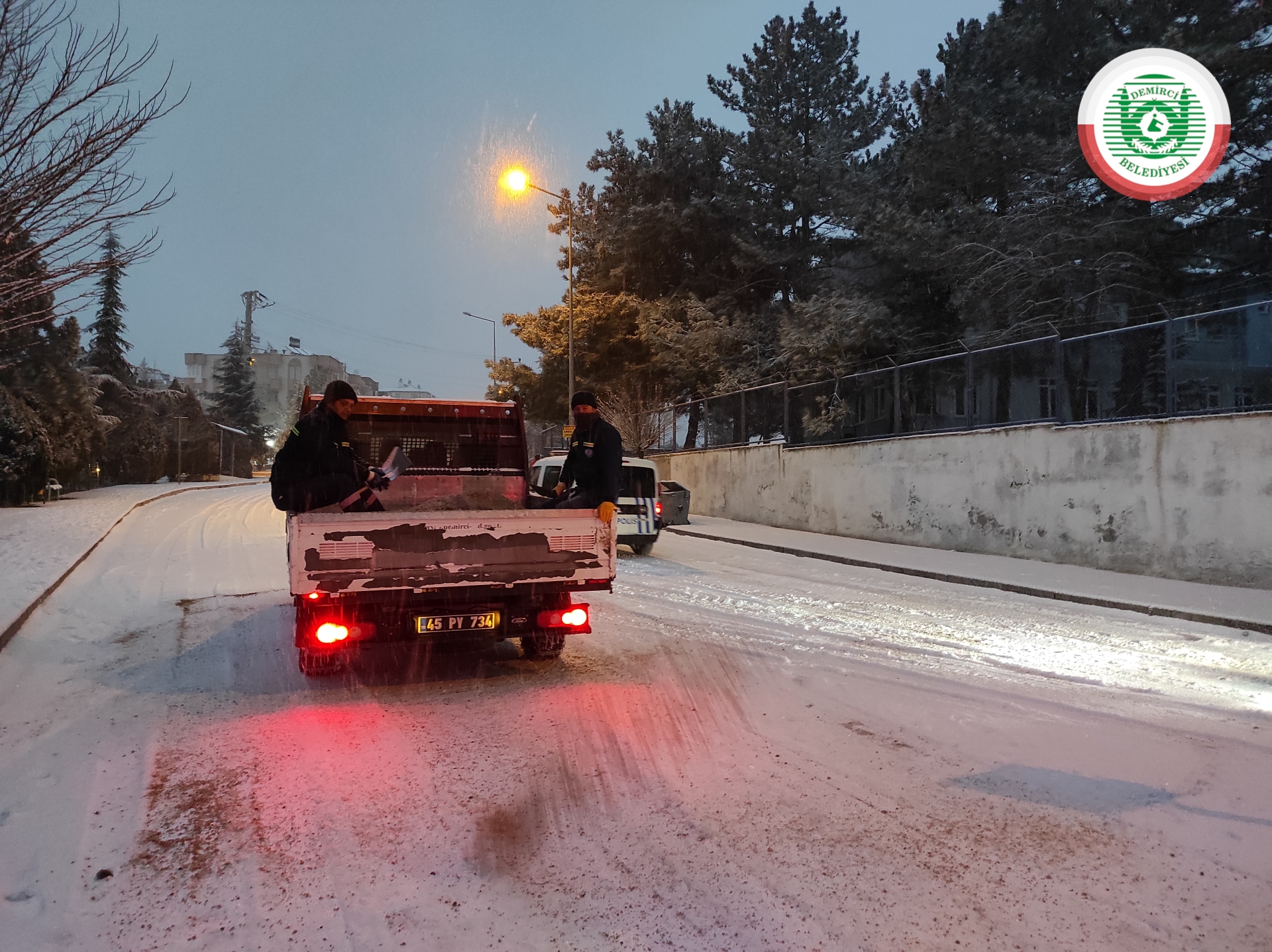Demirci Belediyesi'de 4 tuzlama aracı 1 kepçe ve 1 greyder ile ilçe merkezindeki kar temizleme ve tuzlama çalışması yaptı.