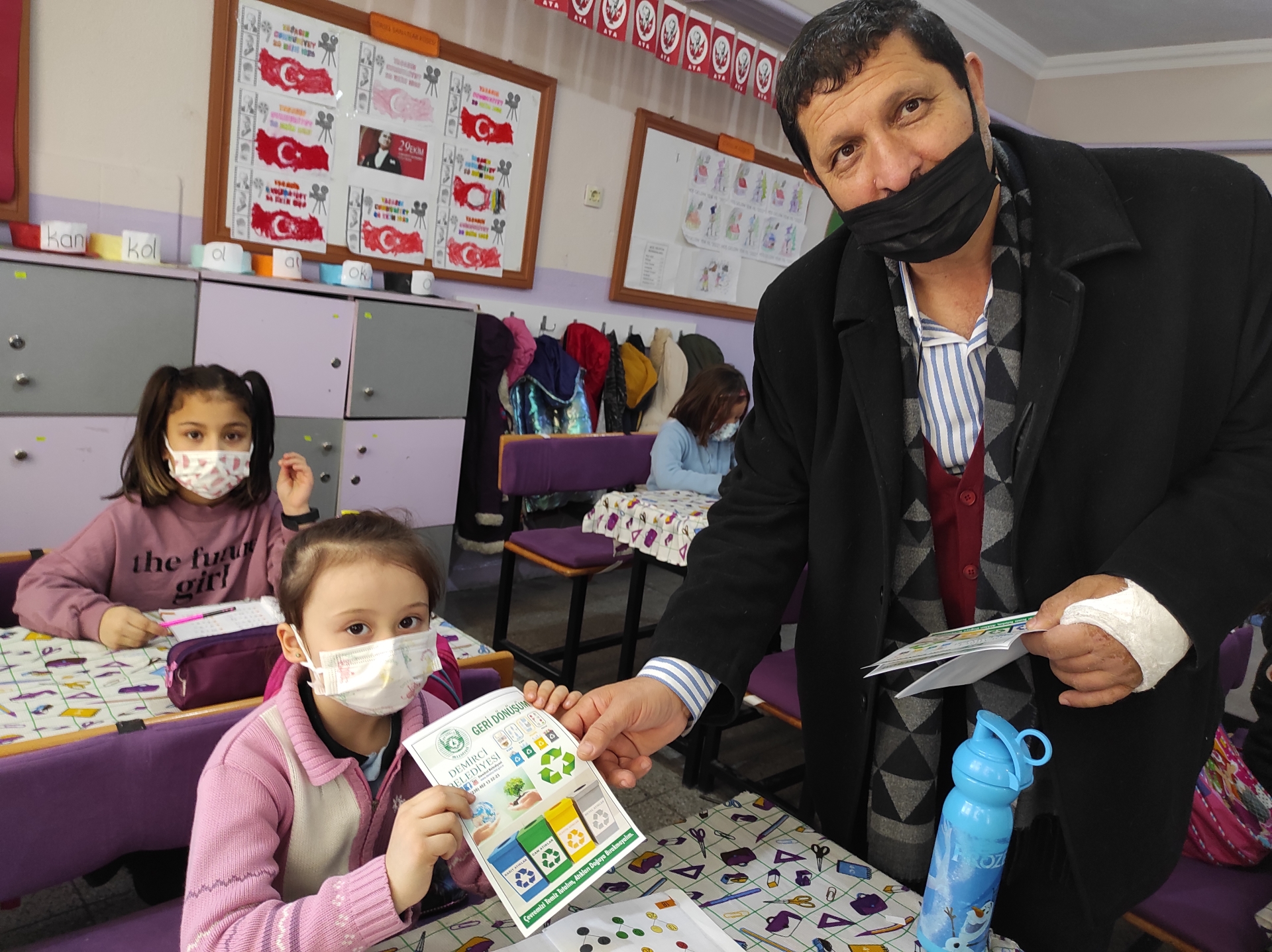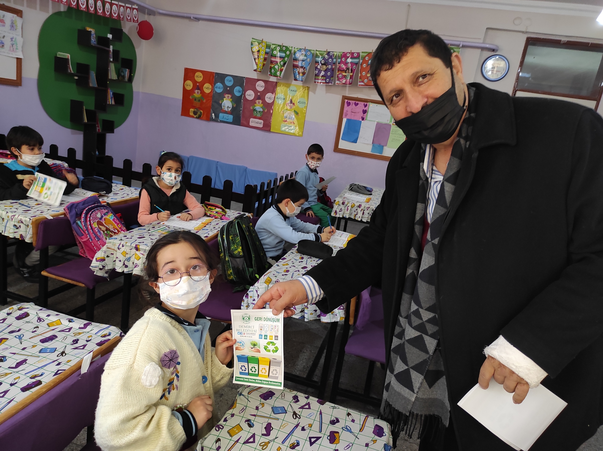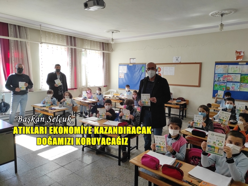 Belediye Başkanı Selami Selçuk'ta Cumhuriyet İlkokulunu ziyaret ederek öğrencilere geri dönüşüm projesi ile ilgili bilgilendirme broşürü dağıttı, geri dönüşümün doğa ve ekonomi için ne kadar önemli olduğunu anlattı.