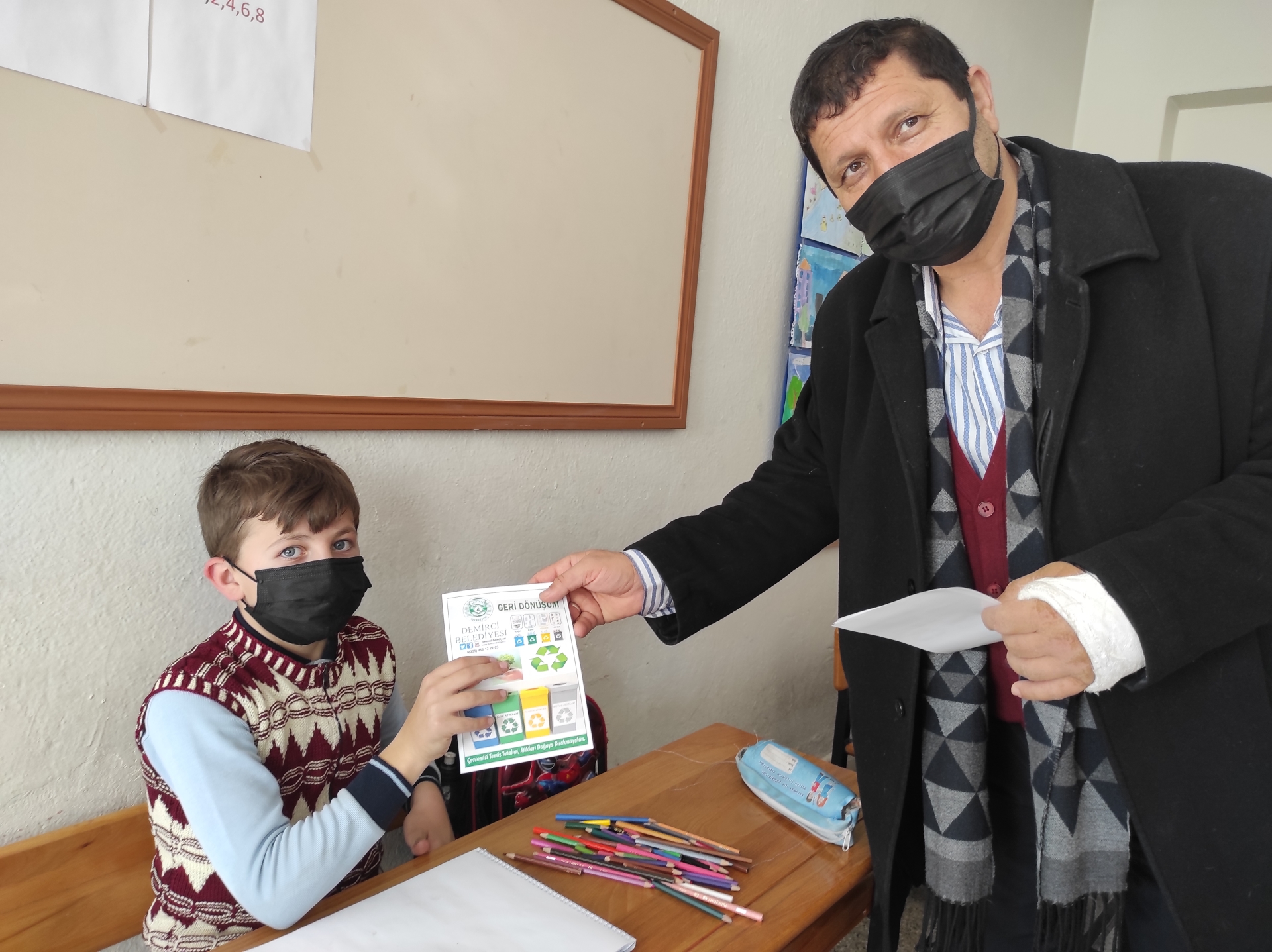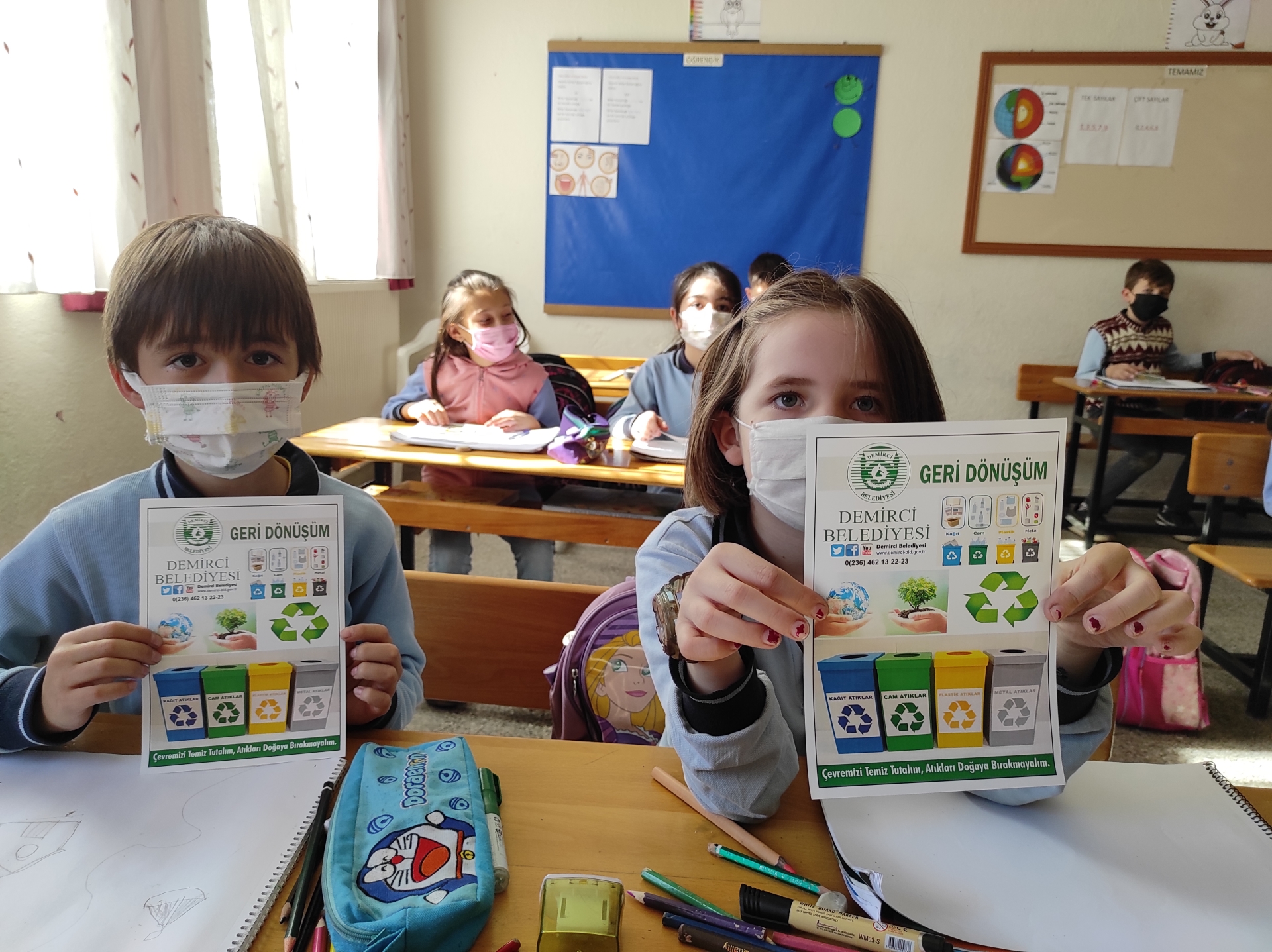 Demirci'de çevreye zarar veren atıkların geri dönüşümü ve ekonomiye kazandırılması ile ilgili proje çalışması yapılırken, ilçedeki okullarda da geri dönüşüm kutuları oluşturuldu.