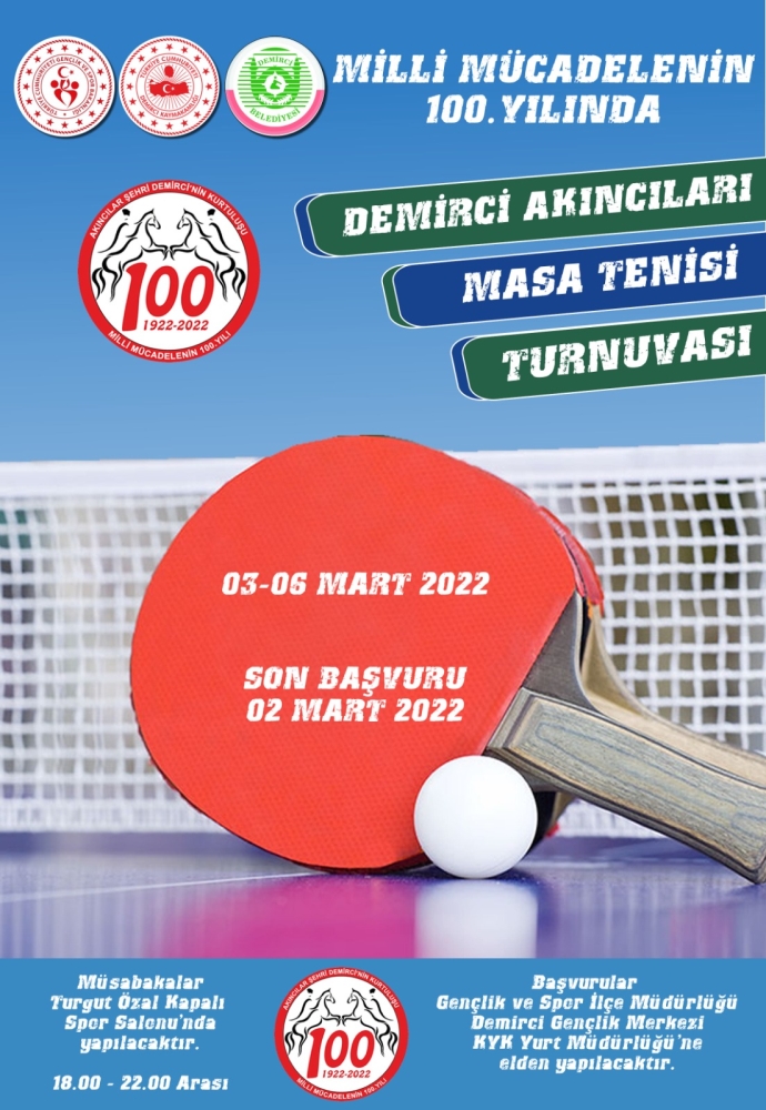 Demirci Kaymakamlığı, Demirci Belediyesi ve Gençlik ve Spor İlçe Müdürlüğü işbirliği ile düzenlenecek olan " Demirci Akıncıları Masa Tenisi Turnuvası " için başvurulara başlandı.