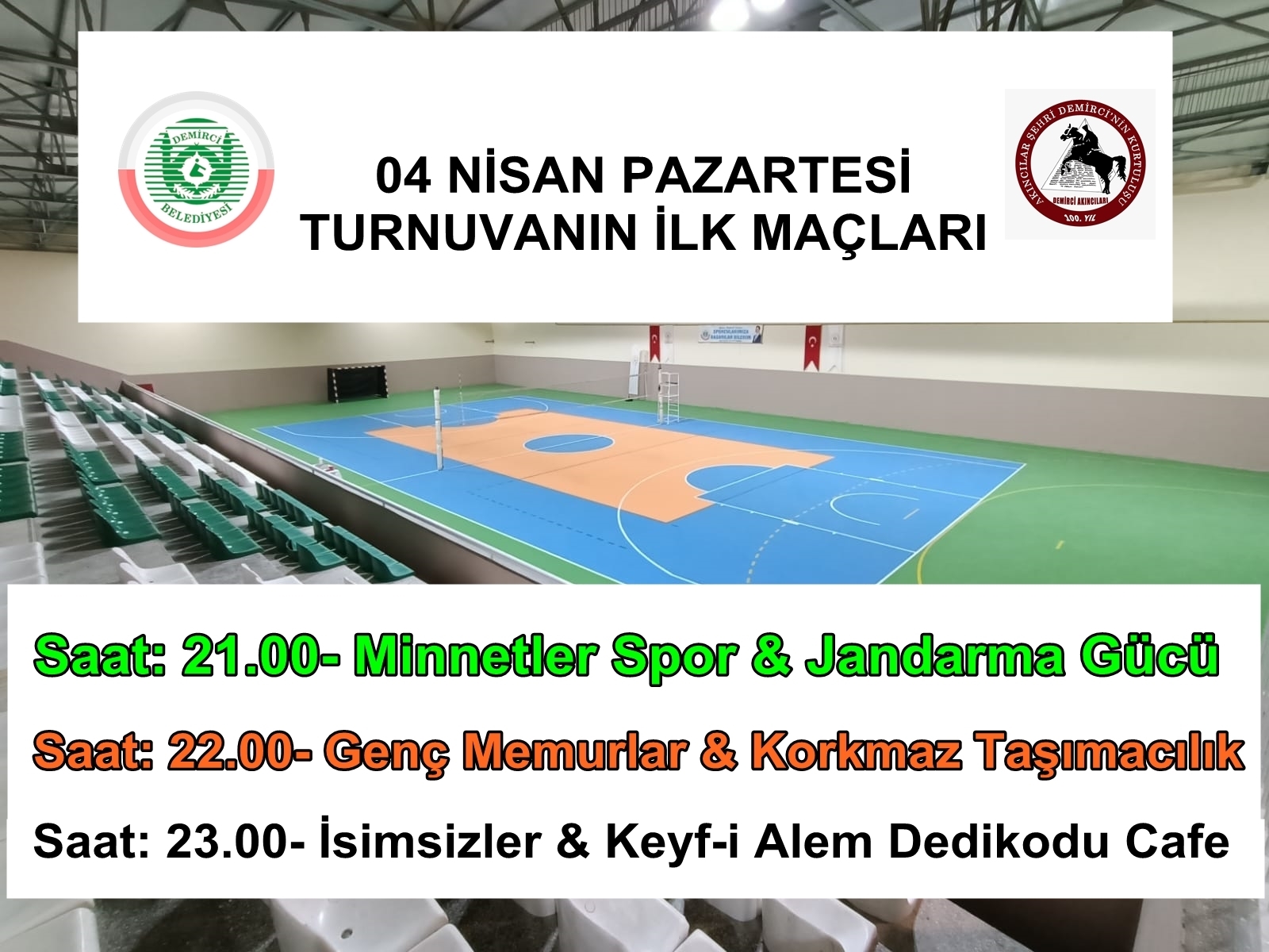 Turgut Özal kapalı spor salonunda yapılacak olan turnuvanın ilk günü olan 04 Nisan Pazartesi günü ilk karşılaşma Saat: 21.00'da Minnetler Spor - Jandarma Gücü oynayacak.
