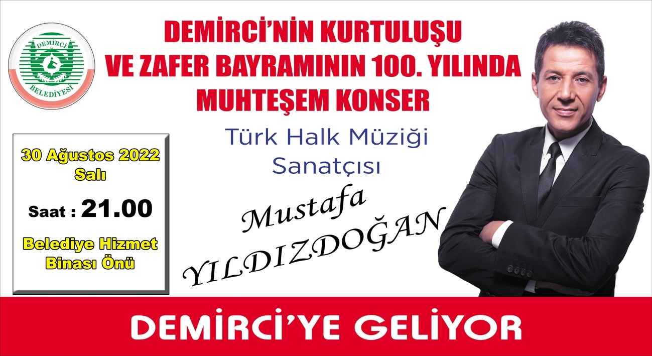 Demirci Belediyesi tarafından Demirci'nin kurtuluşu ve Zafer Bayramının 100. yılı faaliyetleri kapsamında sanatçı Mustafa Yıldızdoğan muhteşem şarkıları ile Demirci'de olacak.