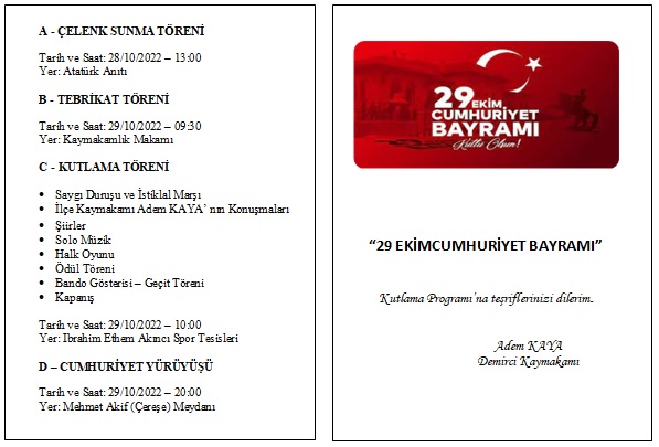29 Ekim Cumhuriyet Bayramının 99. yıldönümü dolayısı ile 28 Ekim Cuma ve 29 Ekim Cumartesi günleri yapılacak olan kutlama programı Demirci Kaymakamlığı tarafından yayınlandı.