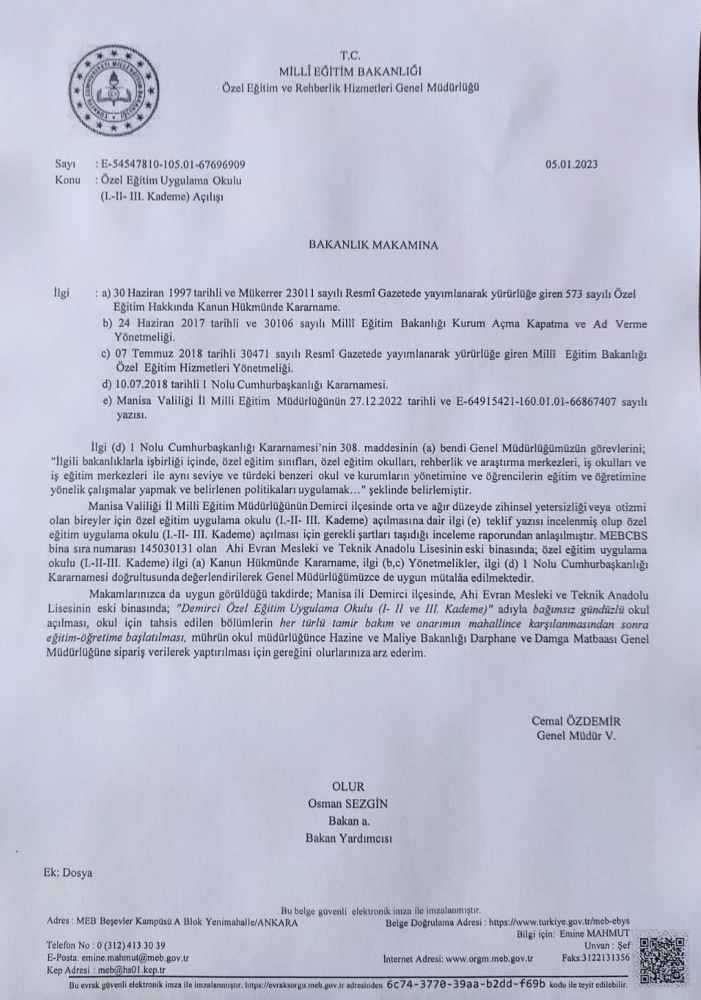 Yapılan görüşmelerin ardından Milli Eğitim Bakanlığınca 5 Ocak 2023 tarihli onay yazısı ile Demirci’ye Özel Eğitim Uygulama Okulu hizmete açılmasına karar verildi.