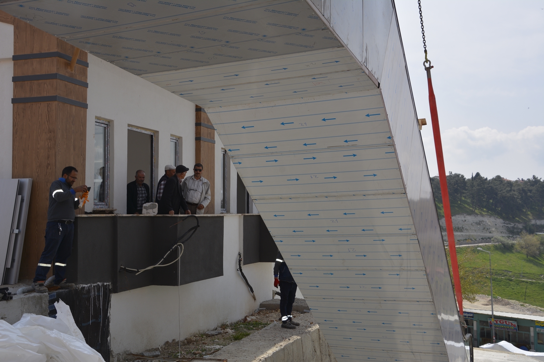 Tırlarla ilçeye nakli sağlanan yürüyen merdivenin ilk bölümü inç yardımıyla Cumhuriyet meydanından pazaryerine iniş alanı olan yere yerleştirildi.