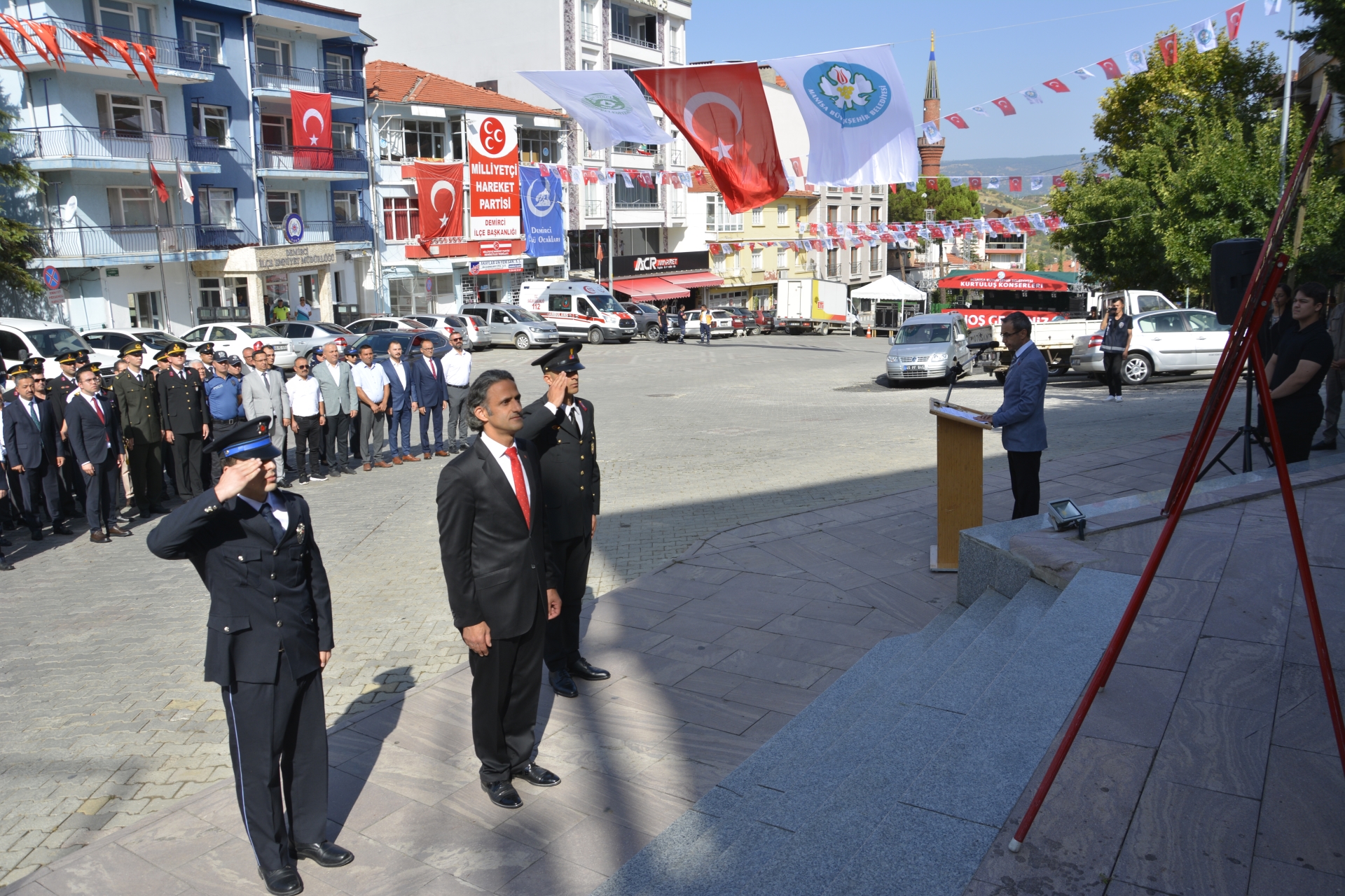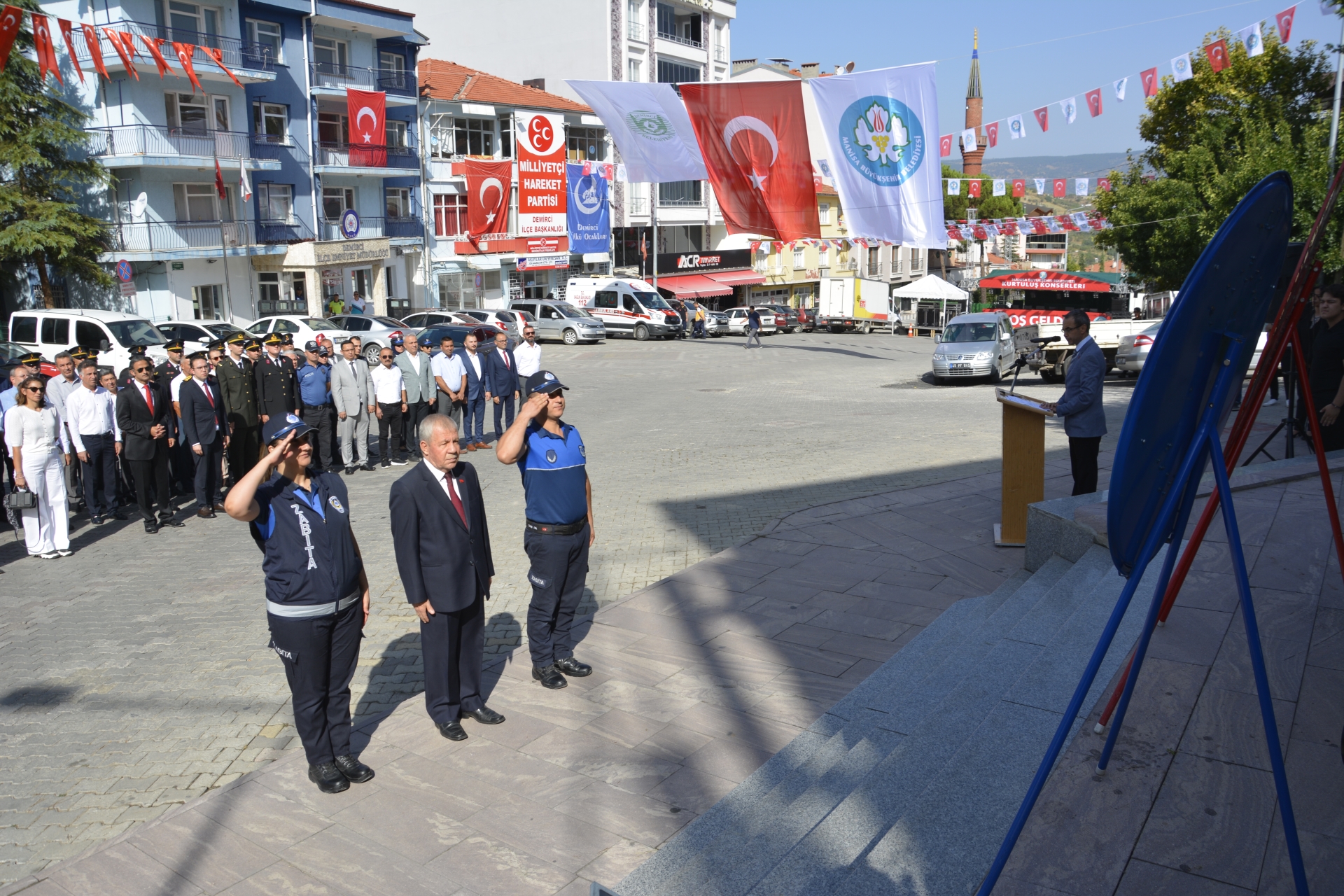 Demirci Kaymakamı Adem Kaya ve Belediye Başkan Vekili Mustafa Ünlü tarafından Atatürk anıtına çelenk sunumu yapıldı.