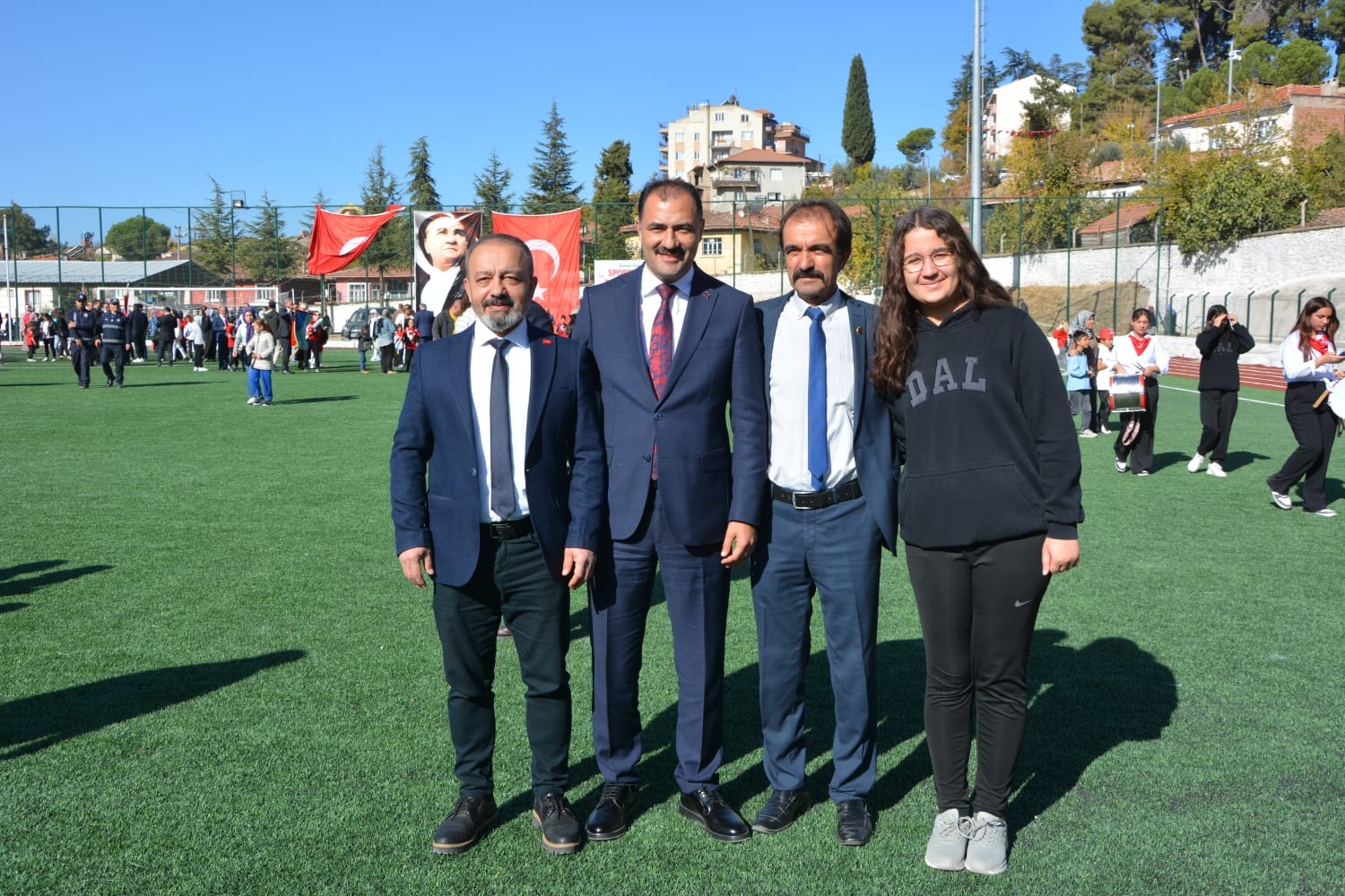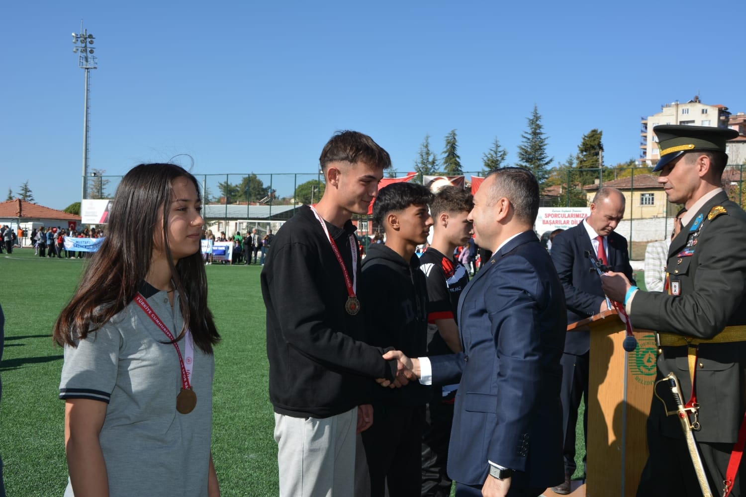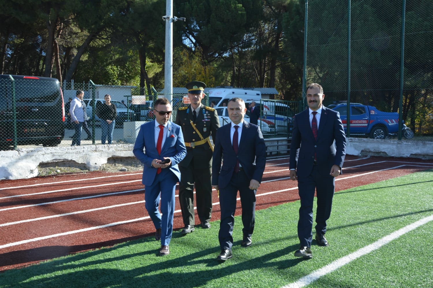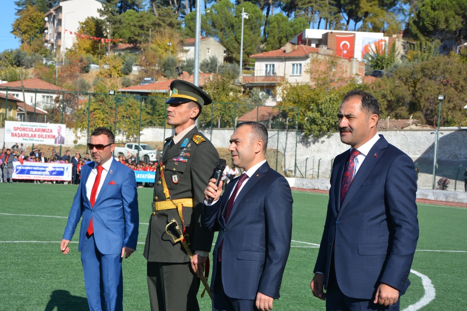 Kaymakamlık makamında düzenlenen tebrikat törenin ardından Kaymakamımız Yavuz Arslan, Garnizon Komutanı Mly. Binbaşı Hüseyin Cihan Korkmaz ve Belediye Başkanımız Erkan Kara törenlerin yapılacağı Kaymakam İbrahim Ethem Akıncı stadına geçiş yaptılar.