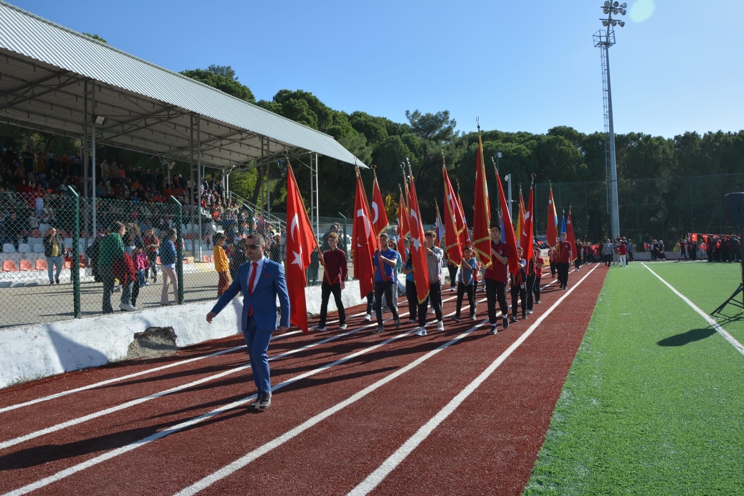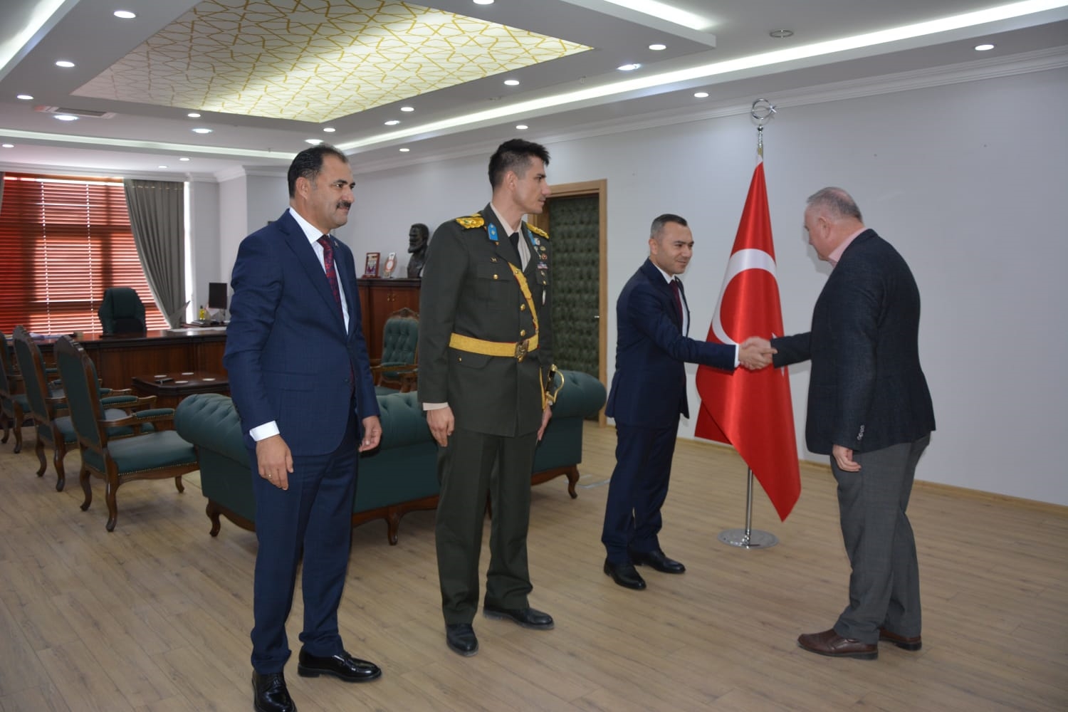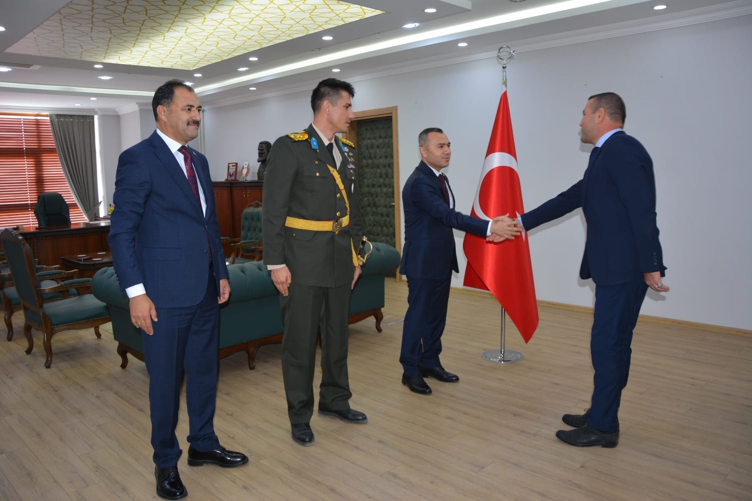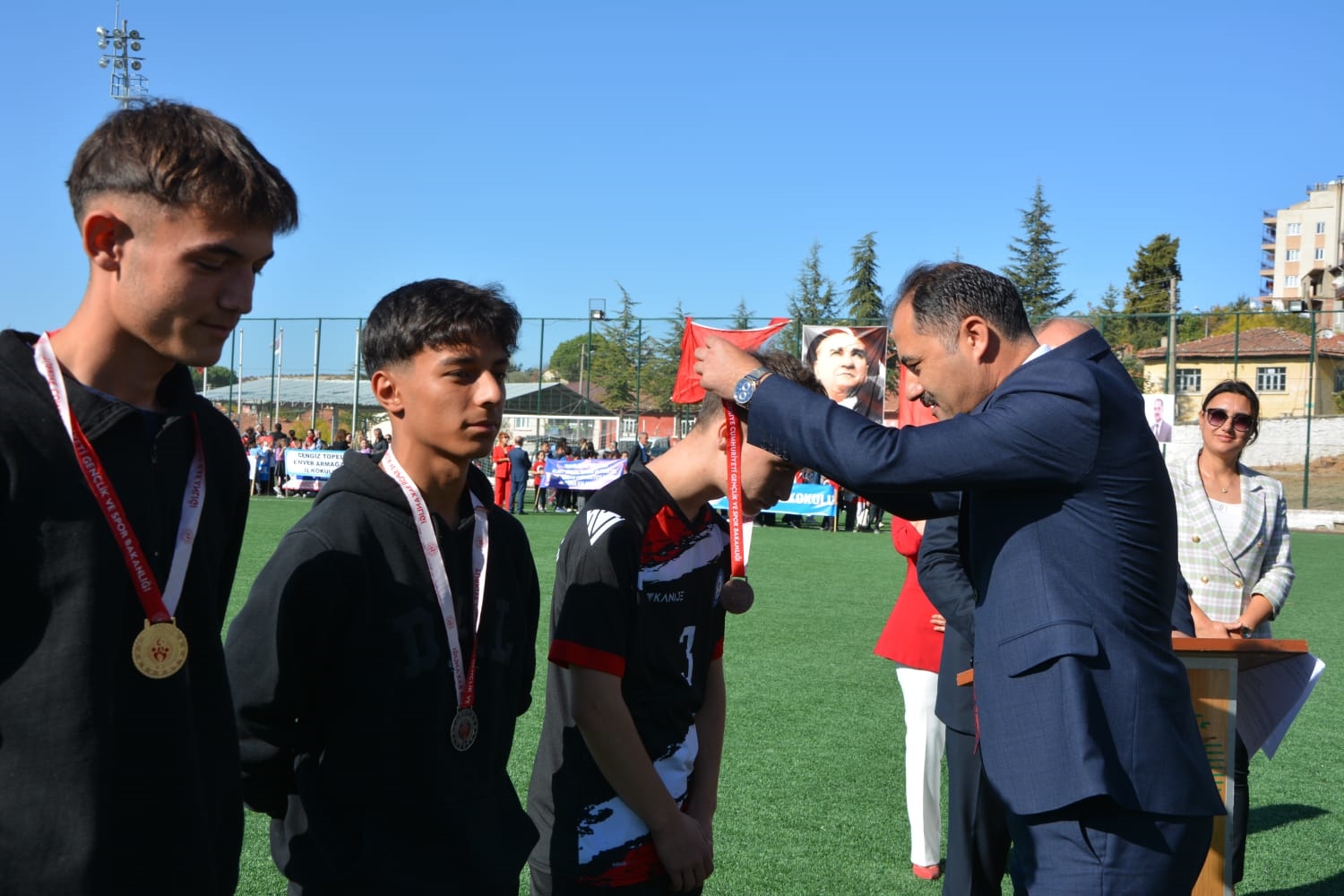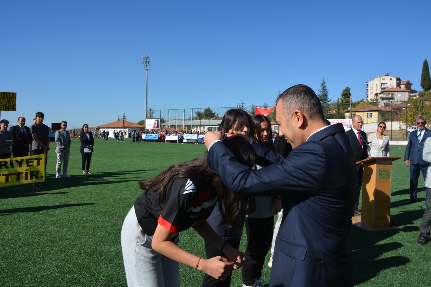 Kaymakamlık makamında düzenlenen tebrikat törenin ardından Kaymakamımız Yavuz Arslan, Garnizon Komutanı Mly. Binbaşı Hüseyin Cihan Korkmaz ve Belediye Başkanımız Erkan Kara törenlerin yapılacağı Kaymakam İbrahim Ethem Akıncı stadına geçiş yaptılar.