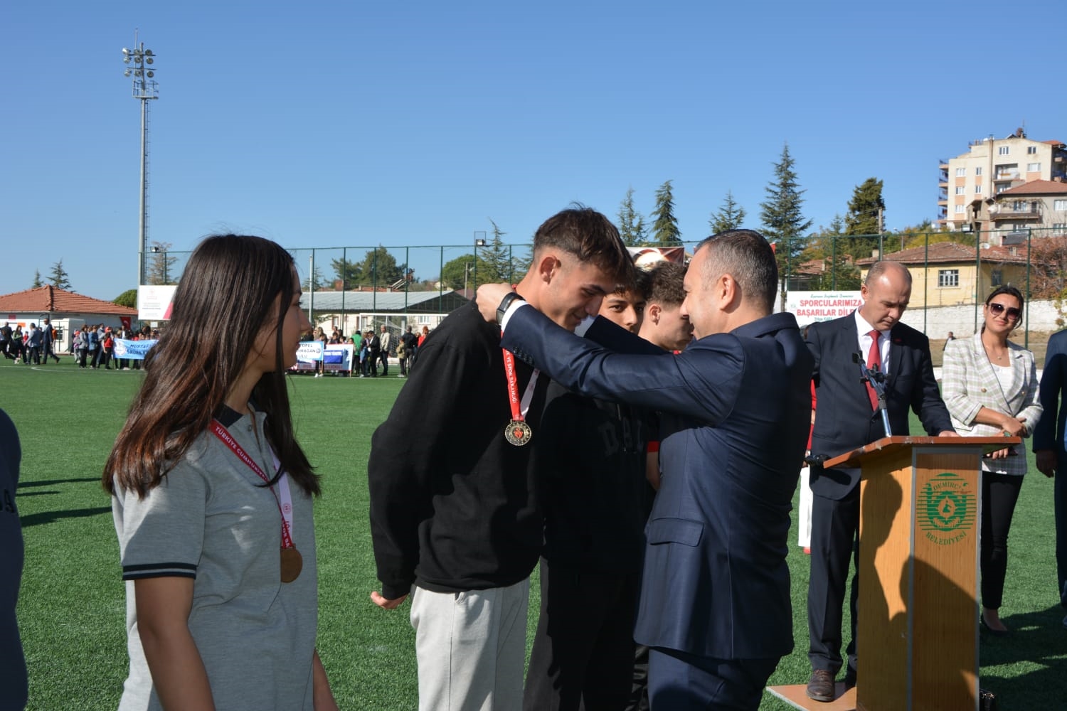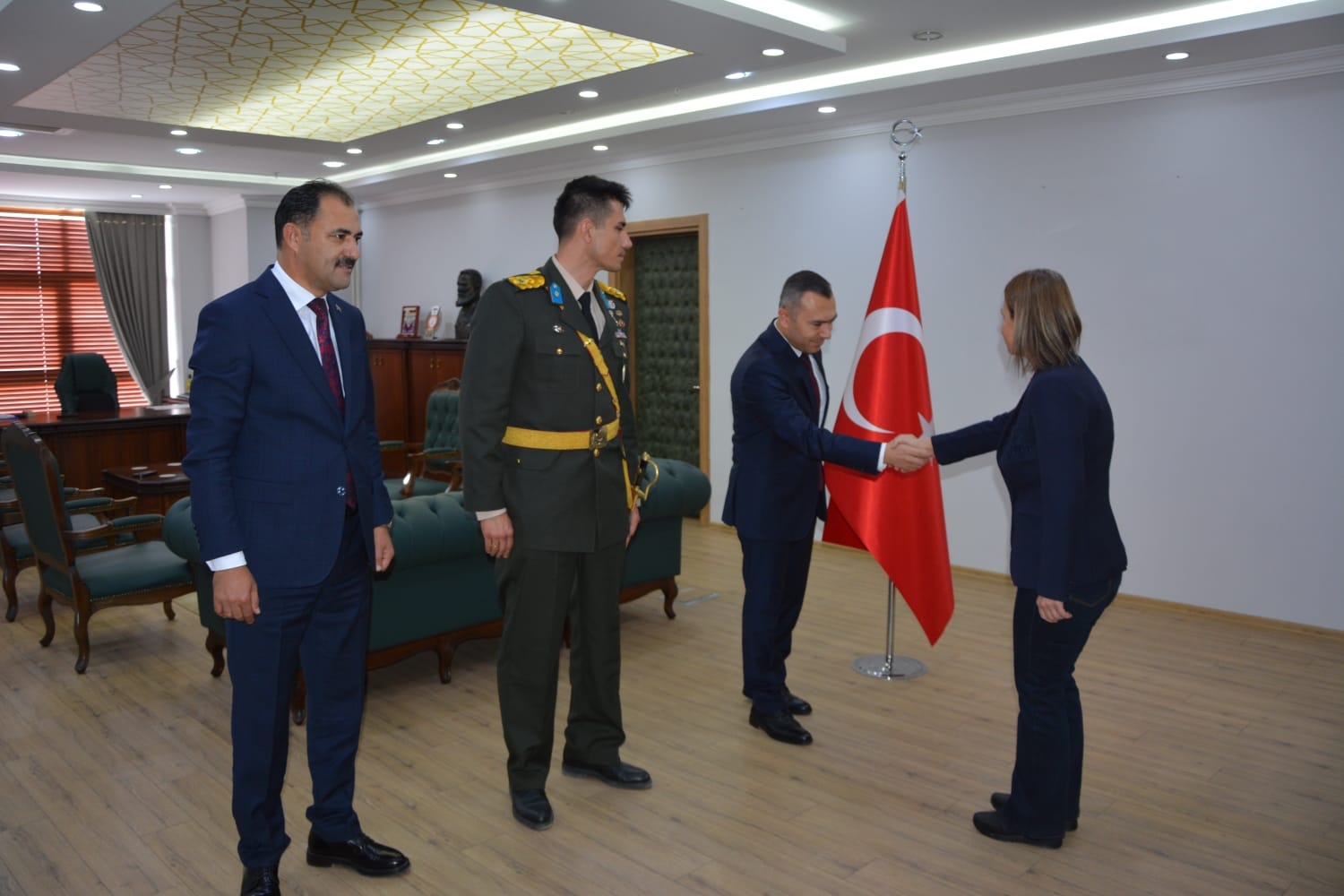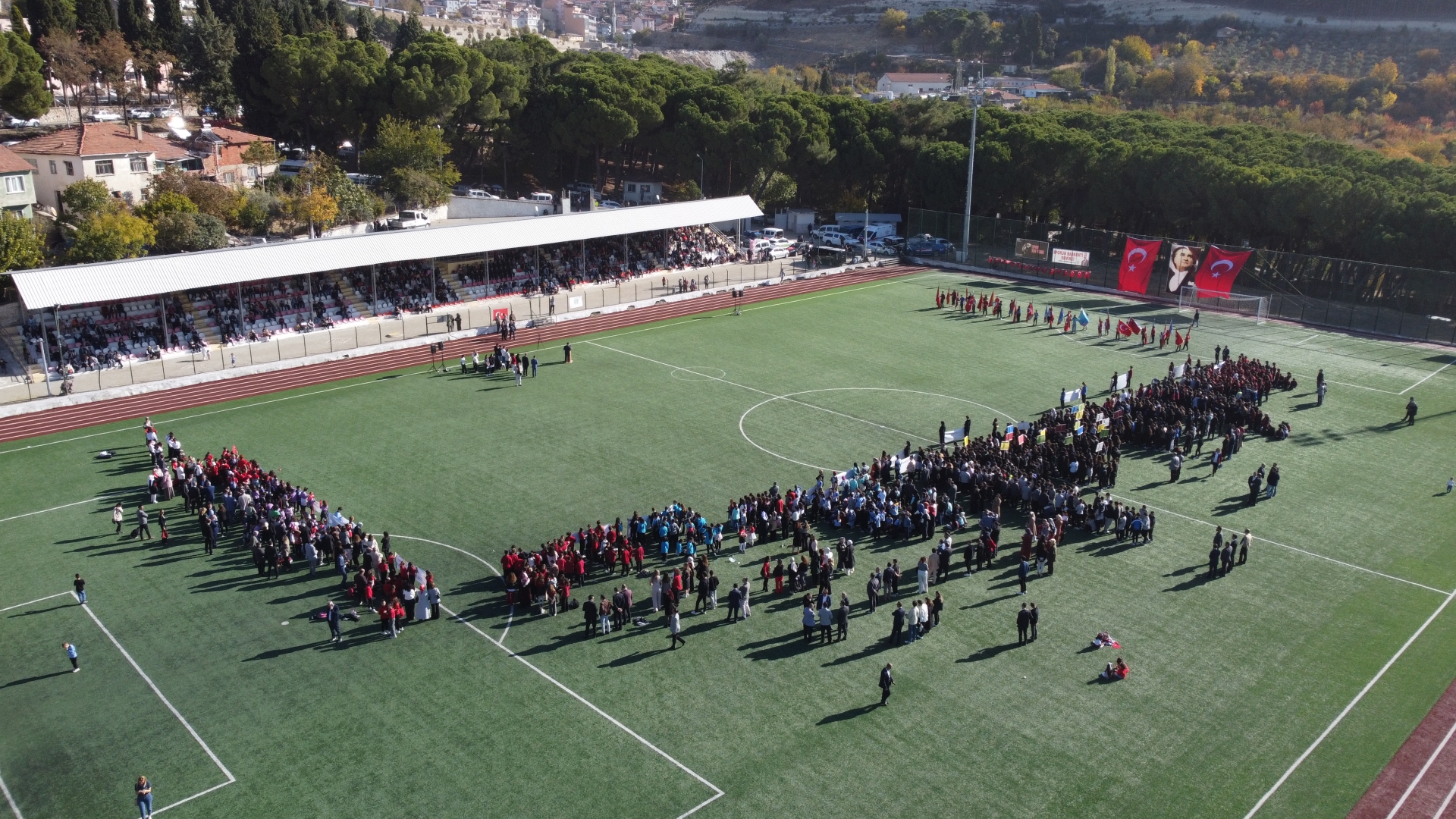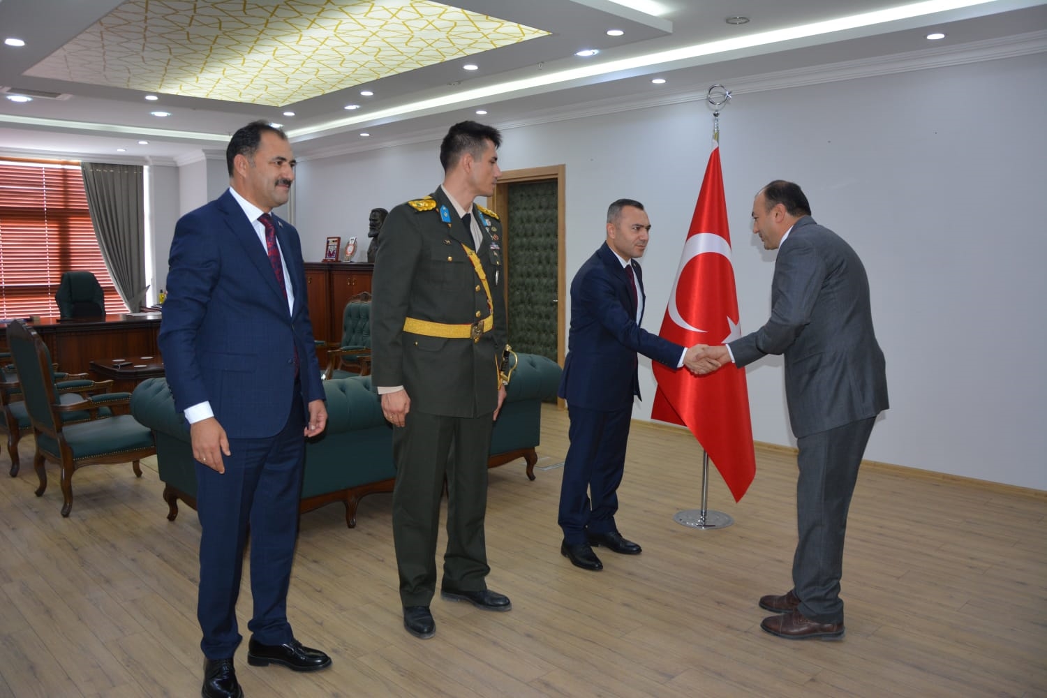 Kaymakamlık makamında düzenlenen tebrikat törenin ardından Kaymakamımız Yavuz Arslan, Garnizon Komutanı Mly. Binbaşı Hüseyin Cihan Korkmaz ve Belediye Başkanımız Erkan Kara törenlerin yapılacağı Kaymakam İbrahim Ethem Akıncı stadına geçiş yaptılar.