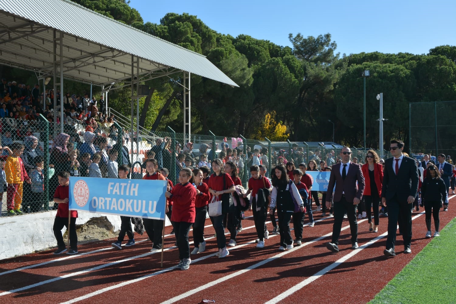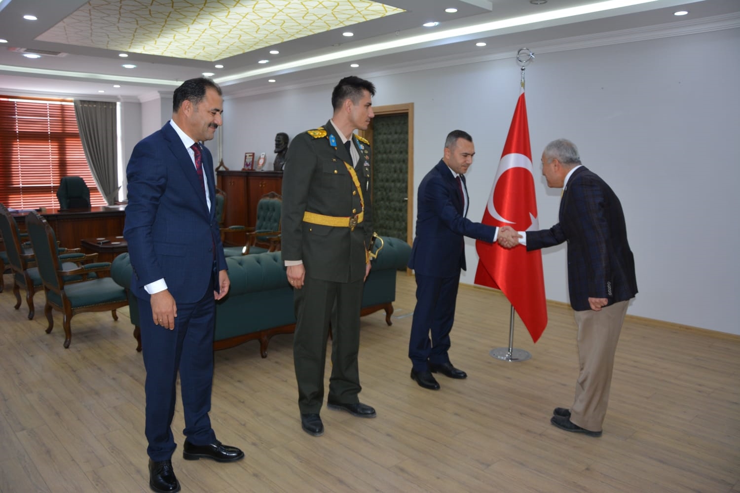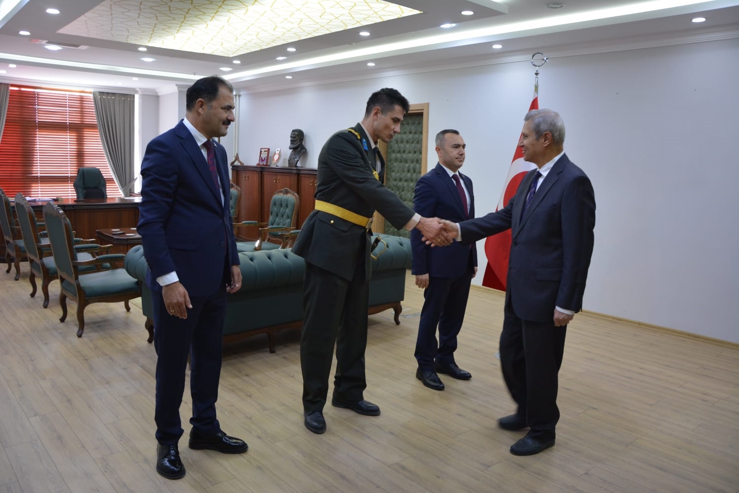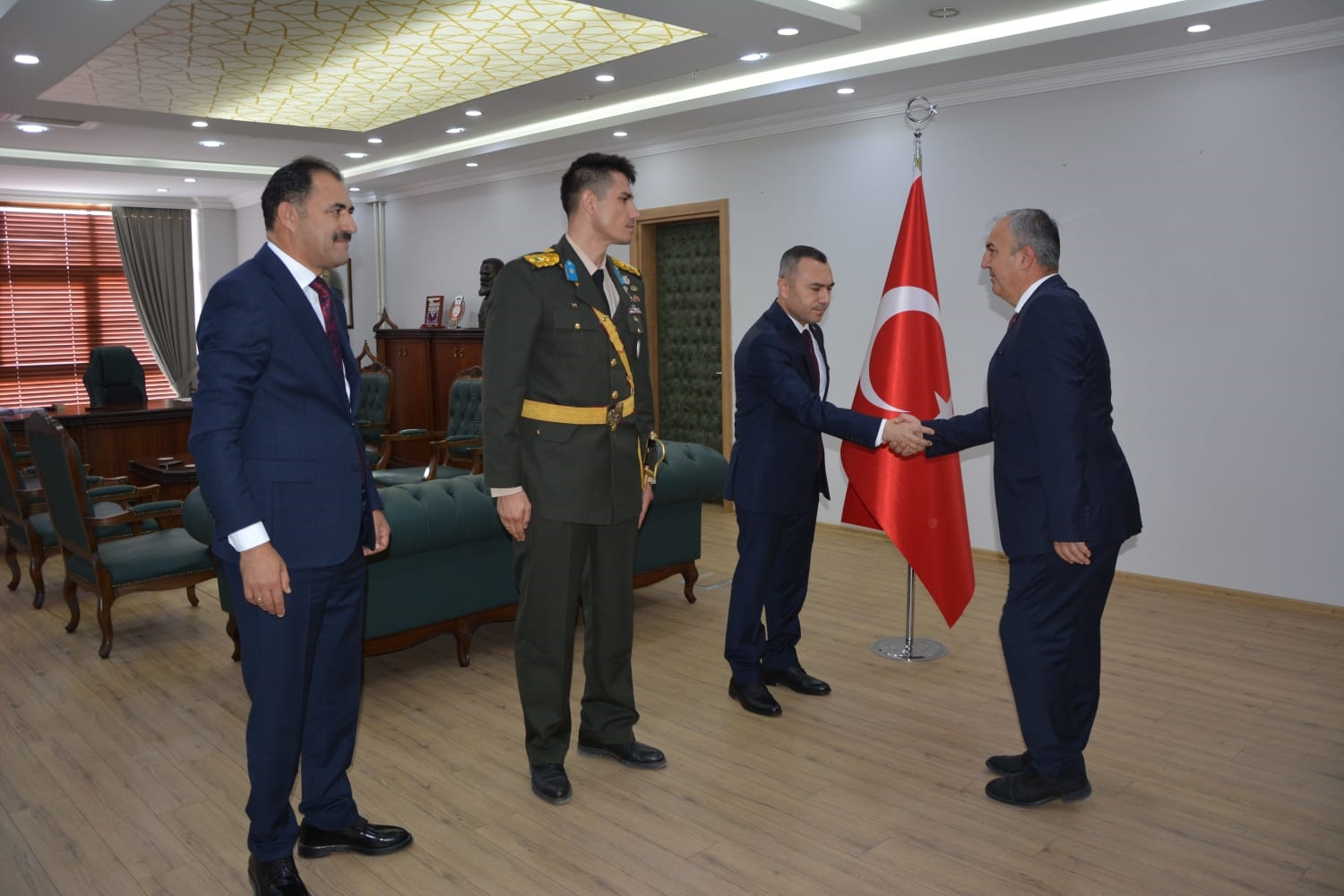 Kaymakamlık makamında düzenlenen tebrikat törenin ardından Kaymakamımız Yavuz Arslan, Garnizon Komutanı Mly. Binbaşı Hüseyin Cihan Korkmaz ve Belediye Başkanımız Erkan Kara törenlerin yapılacağı Kaymakam İbrahim Ethem Akıncı stadına geçiş yaptılar.