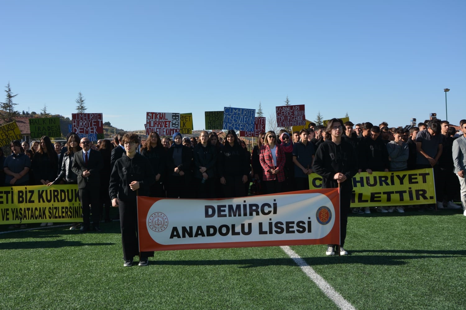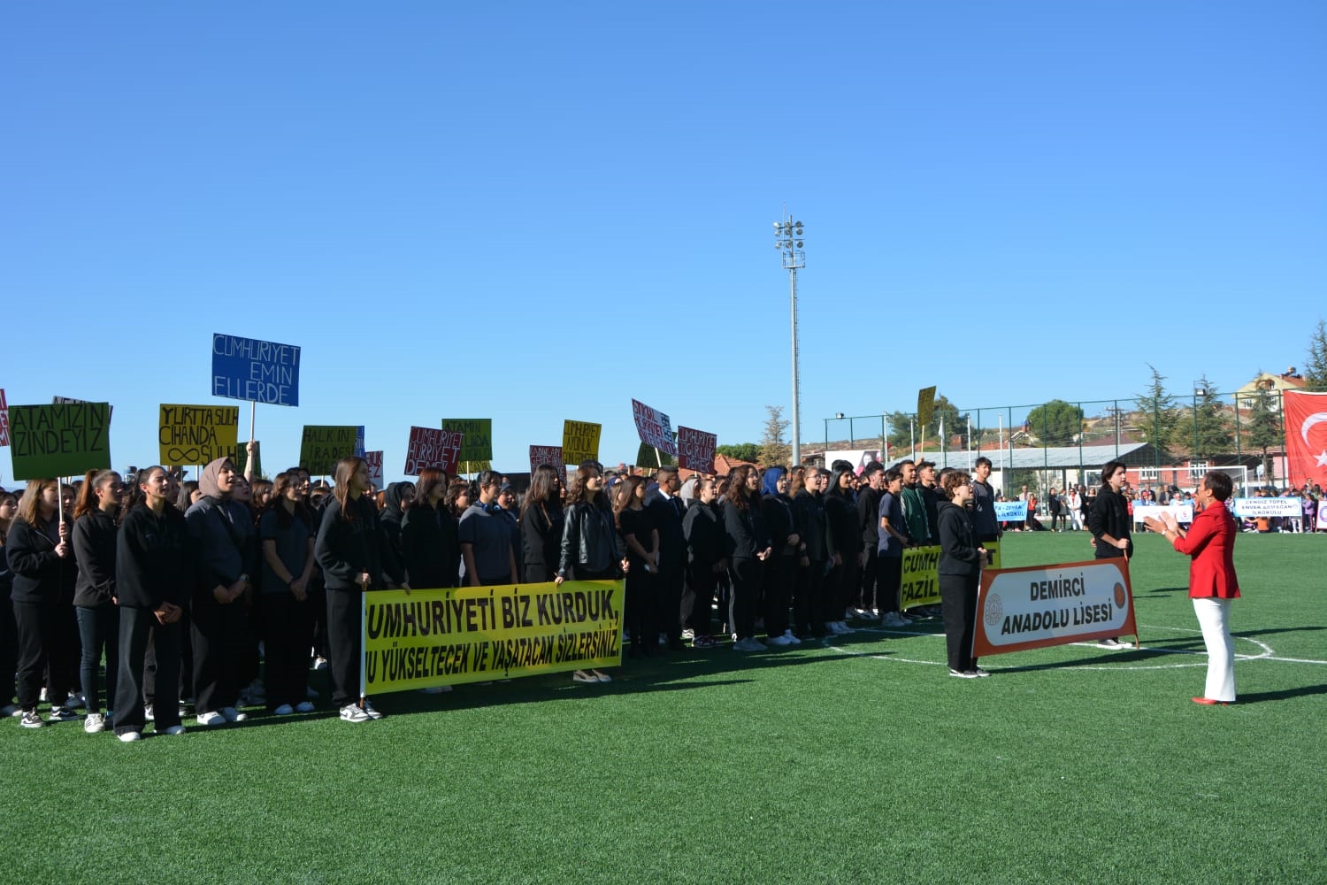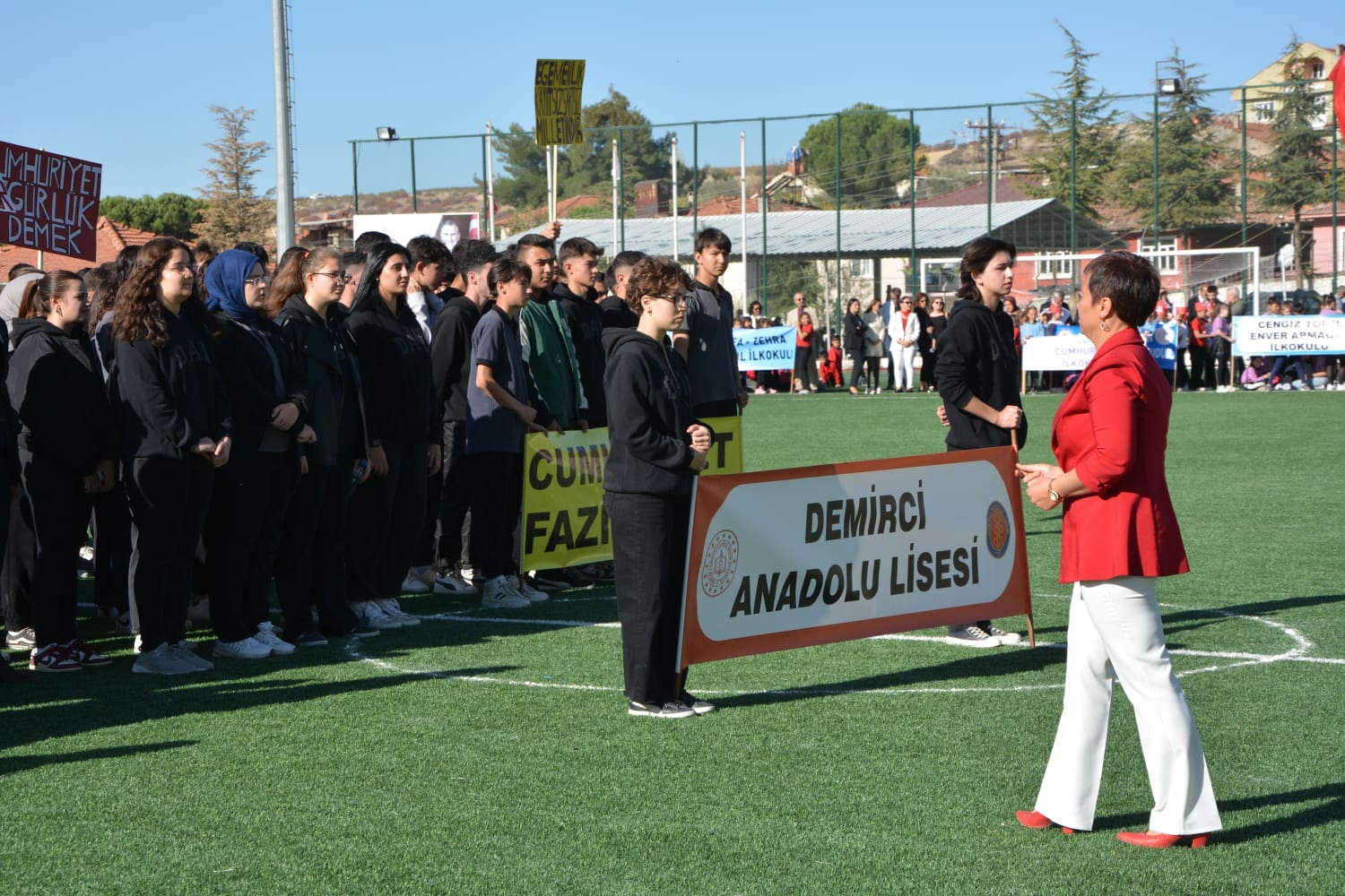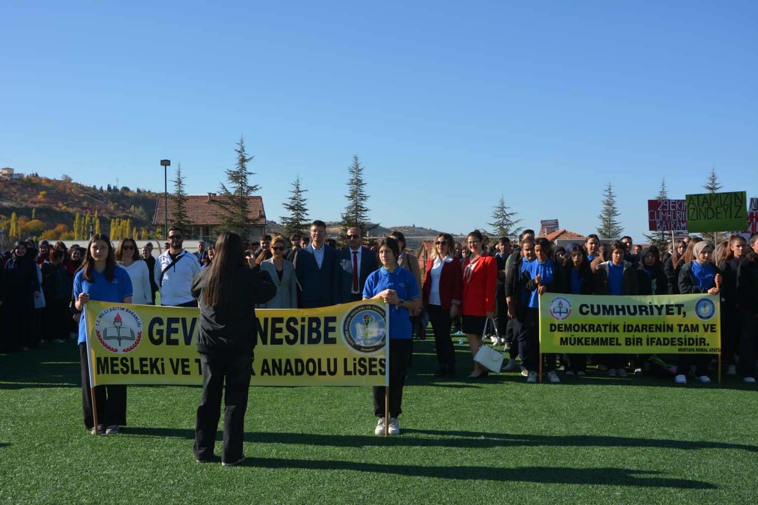Milli Eğitim Müdürlüğü koordinasyonunda Anadolu Lisesi tarafından düzenlenen Cumhuriyet Bayramı törenlerinde öğrenciler tarafından öğretmen marşı, bando gösterisi, keman ve halk oyunları sergilendi.