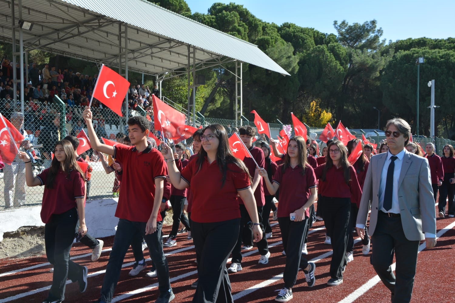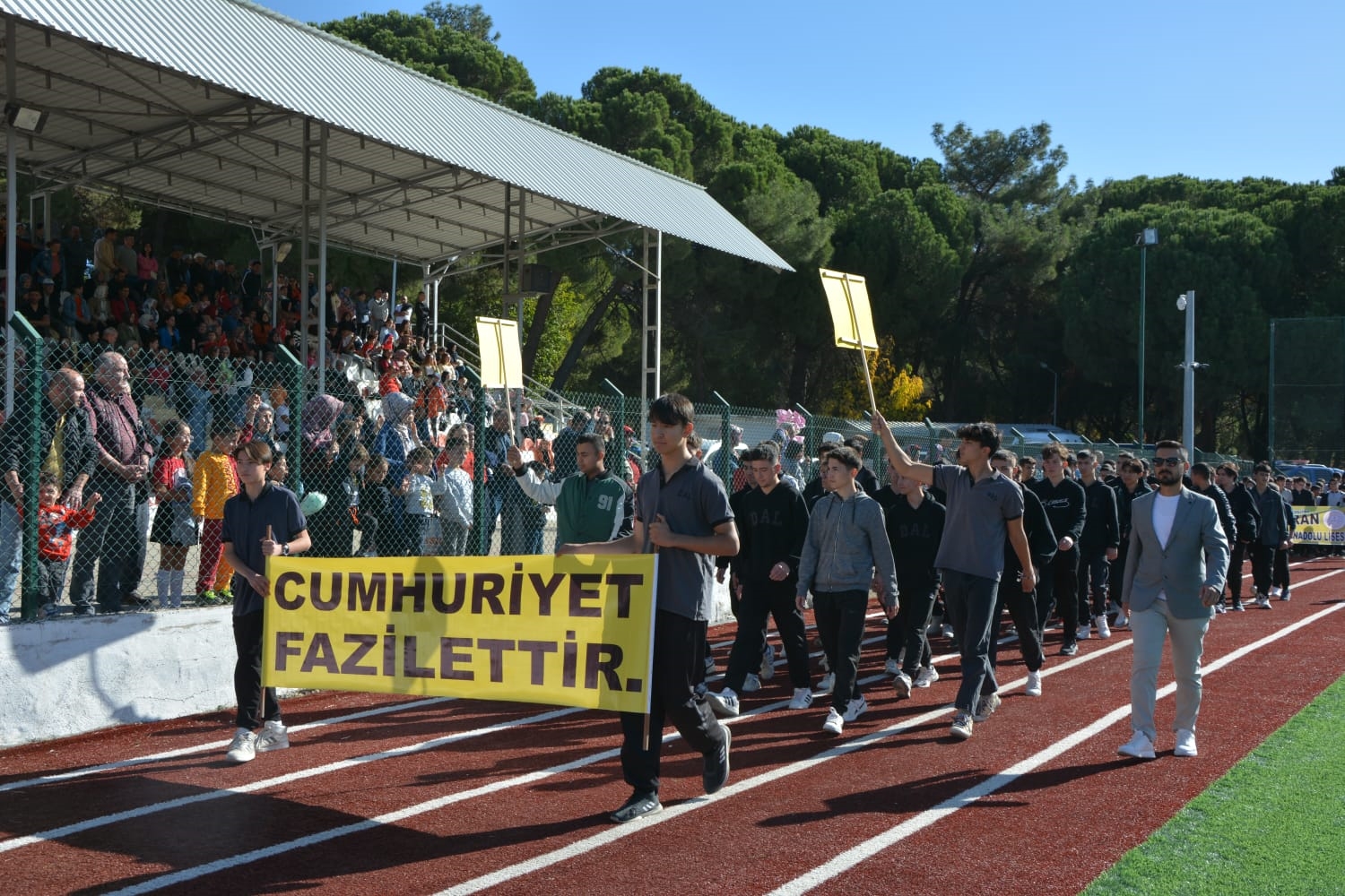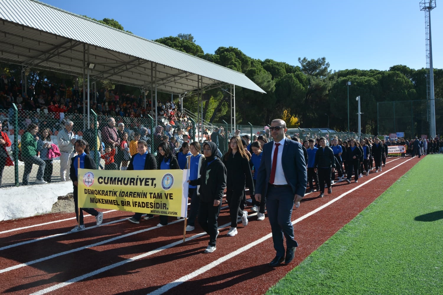 Milli Eğitim Müdürlüğü koordinasyonunda Anadolu Lisesi tarafından düzenlenen Cumhuriyet Bayramı törenlerinde öğrenciler tarafından öğretmen marşı, bando gösterisi, keman ve halk oyunları sergilendi.