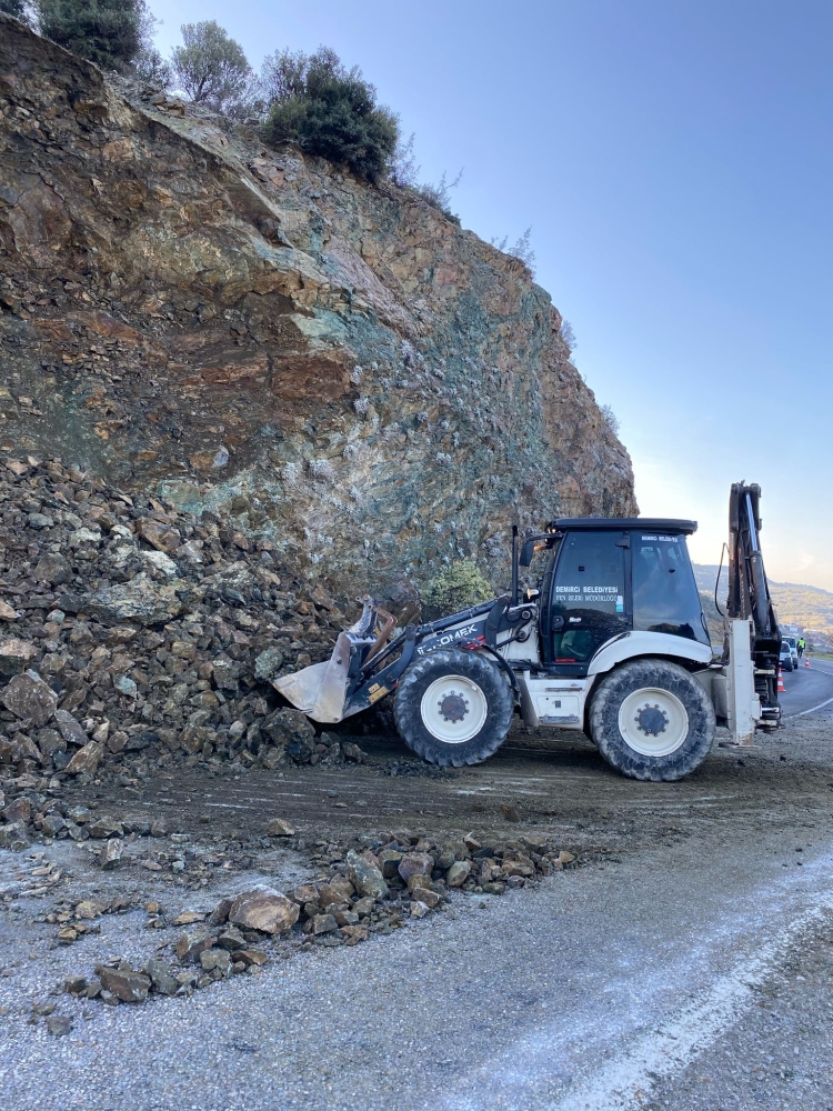 Demirci Belediyesine ait kepçe ve Karayolları ekipleri tarafından yoldaki kayalar ve topraklar temizlenerek trafiğe açıldı.