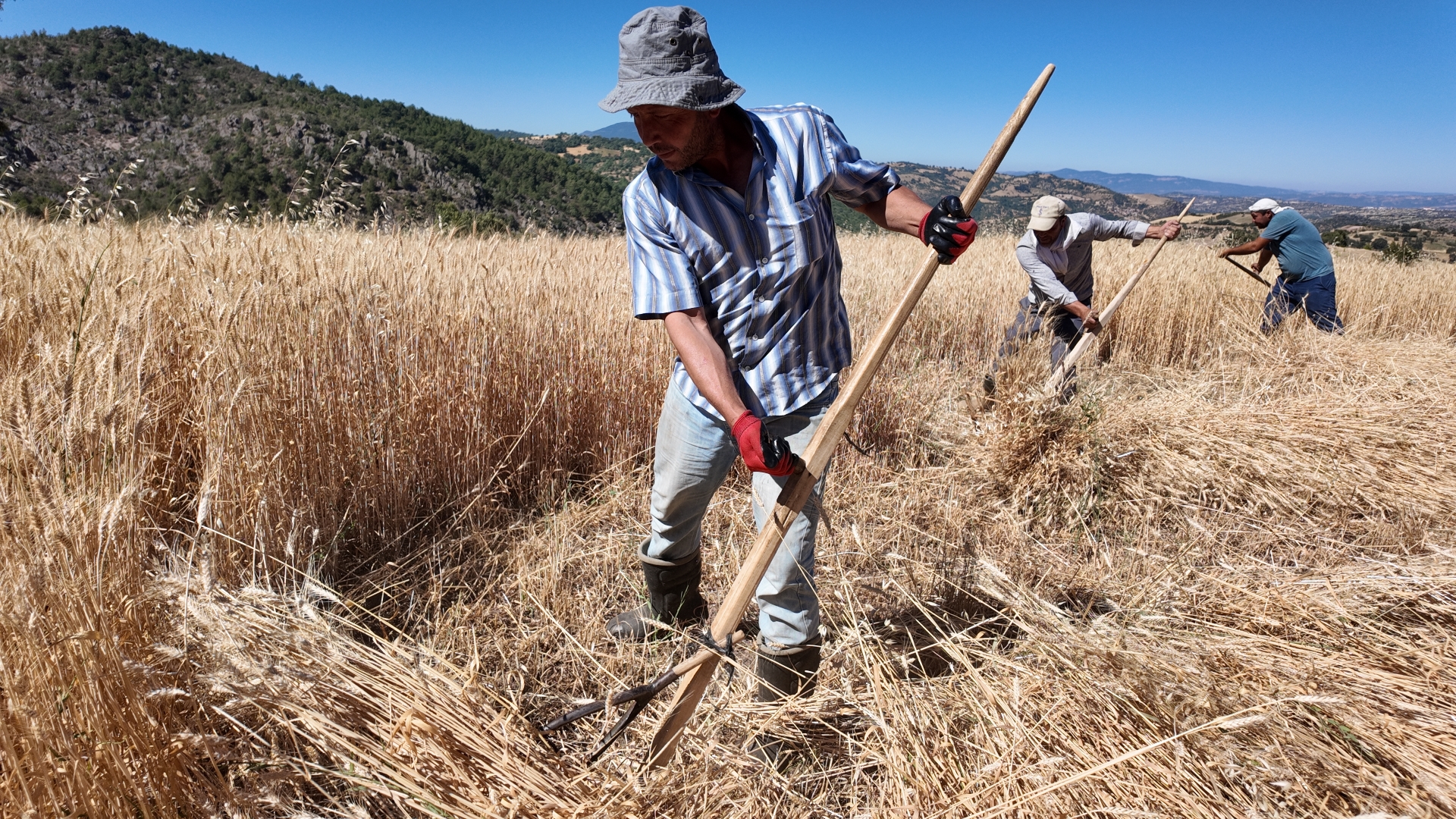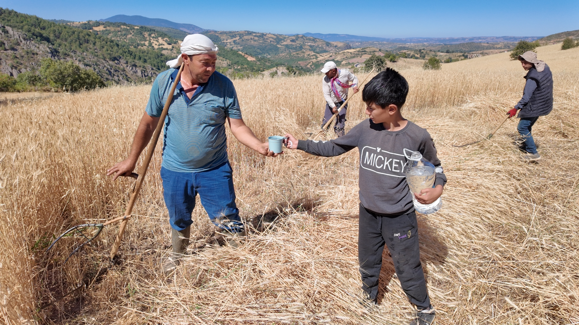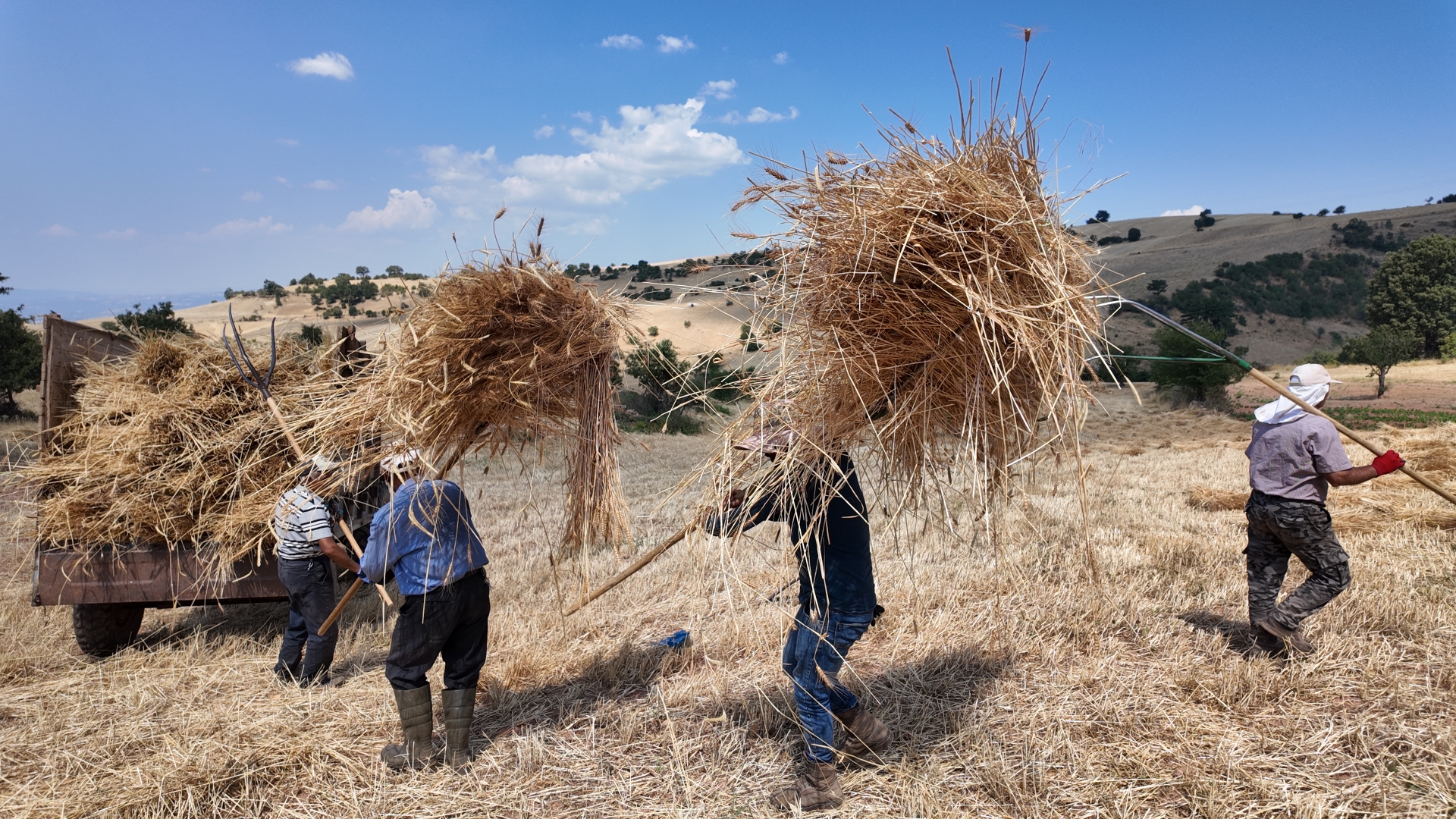 Erkekler tarafından toplanan ekinler kadınlar tarafından da çevrede kalan arpa ve buğday saplarını da tırmıklarla toplayarak yardım ediyor.