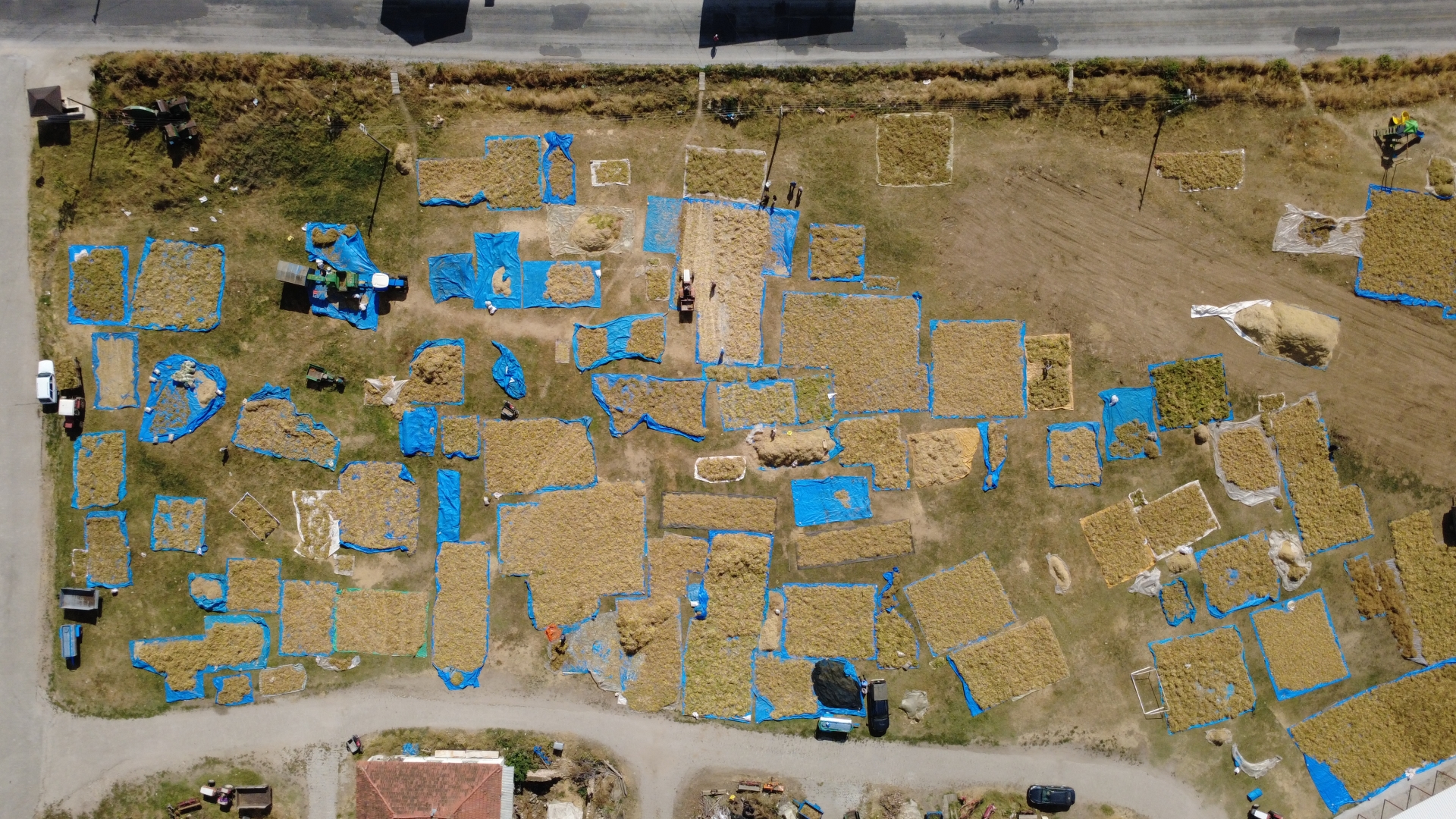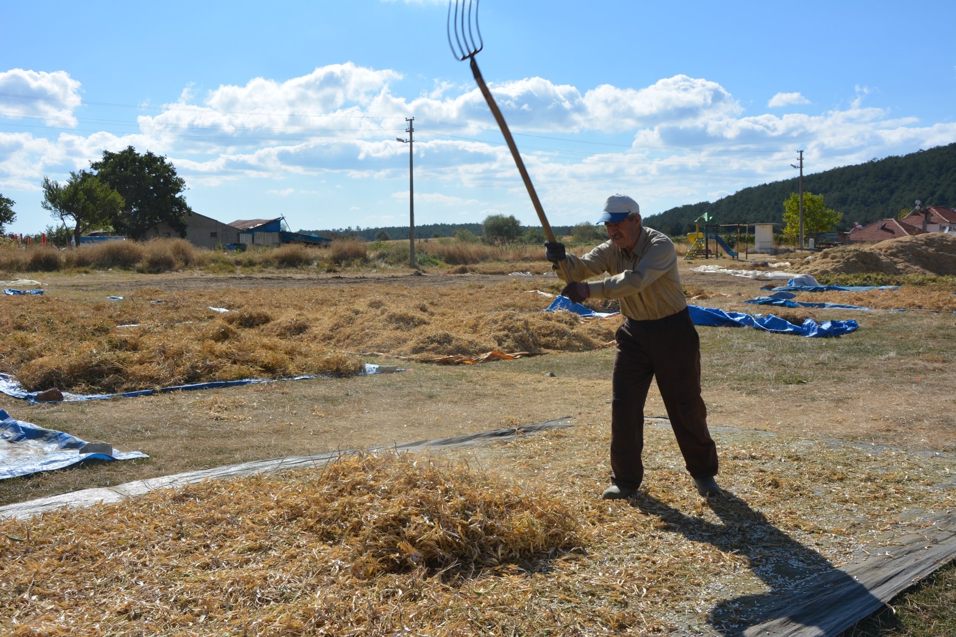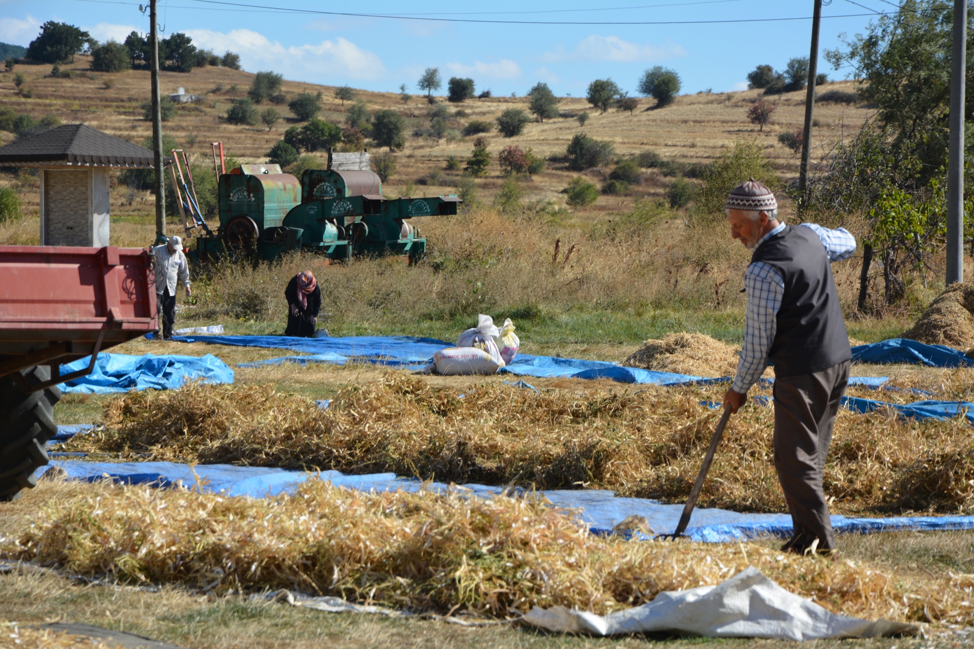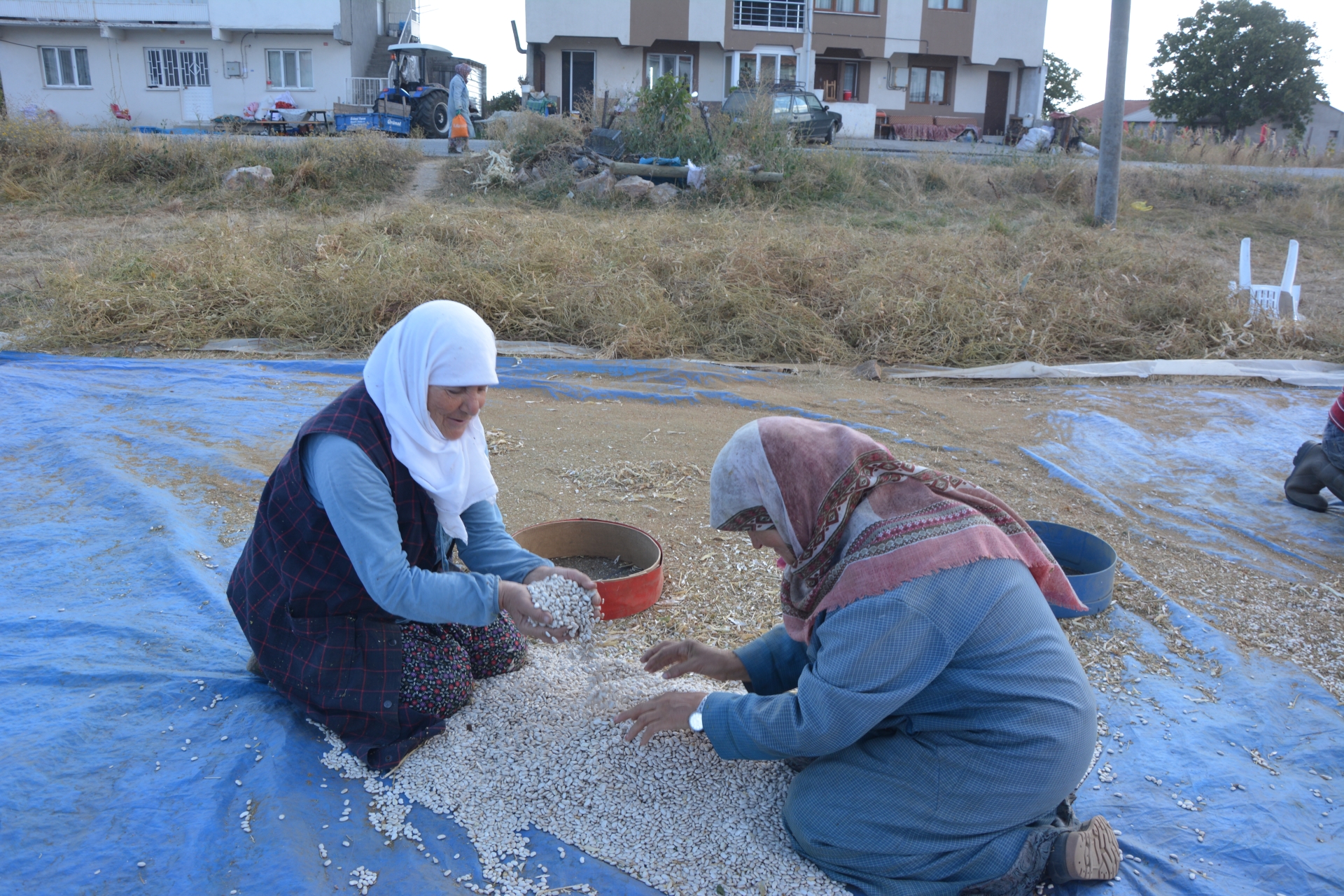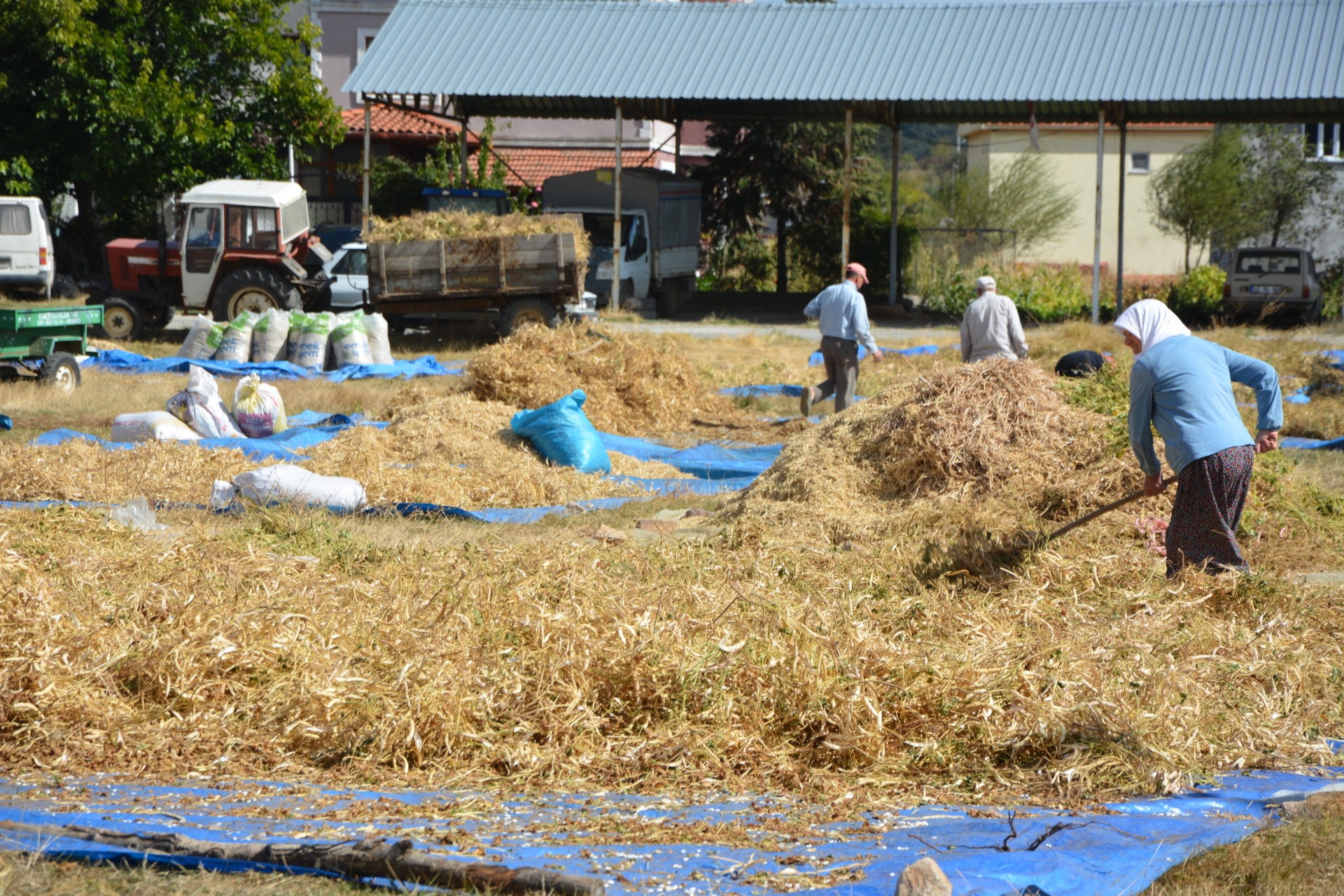Tarladan traktör römorklarına konulan fasulye başakları mahallenin harmanına getirilerek güneşte kurutulmak üzere seriliyor.