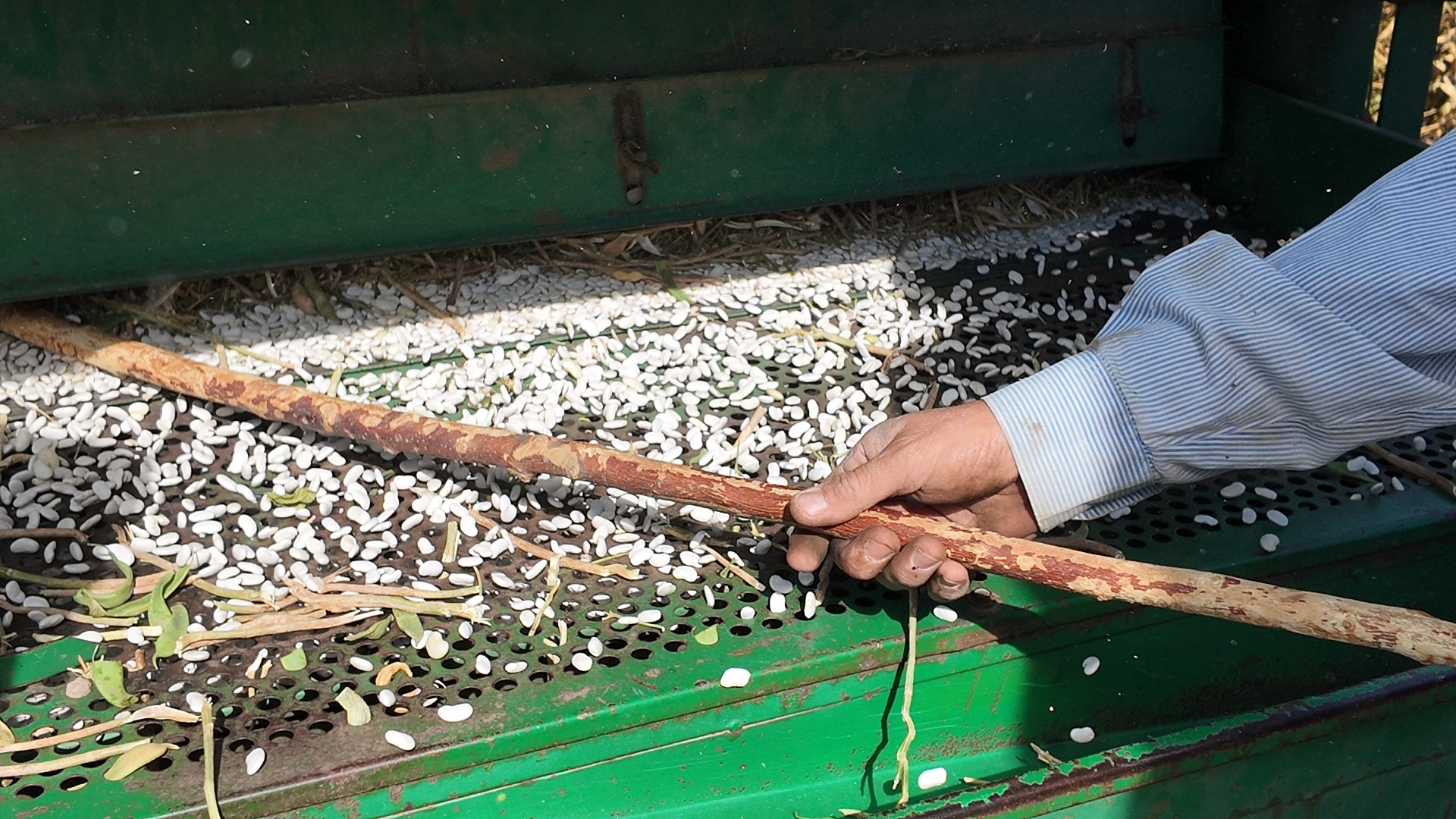 3 ila 5 gün harmanda serili kalan fasulye başakları daha sonra geleneksel usul olan çomak ile çırpma, traktör ile ezme yapılırken, patoz makinesi ile de yapılabiliyor.