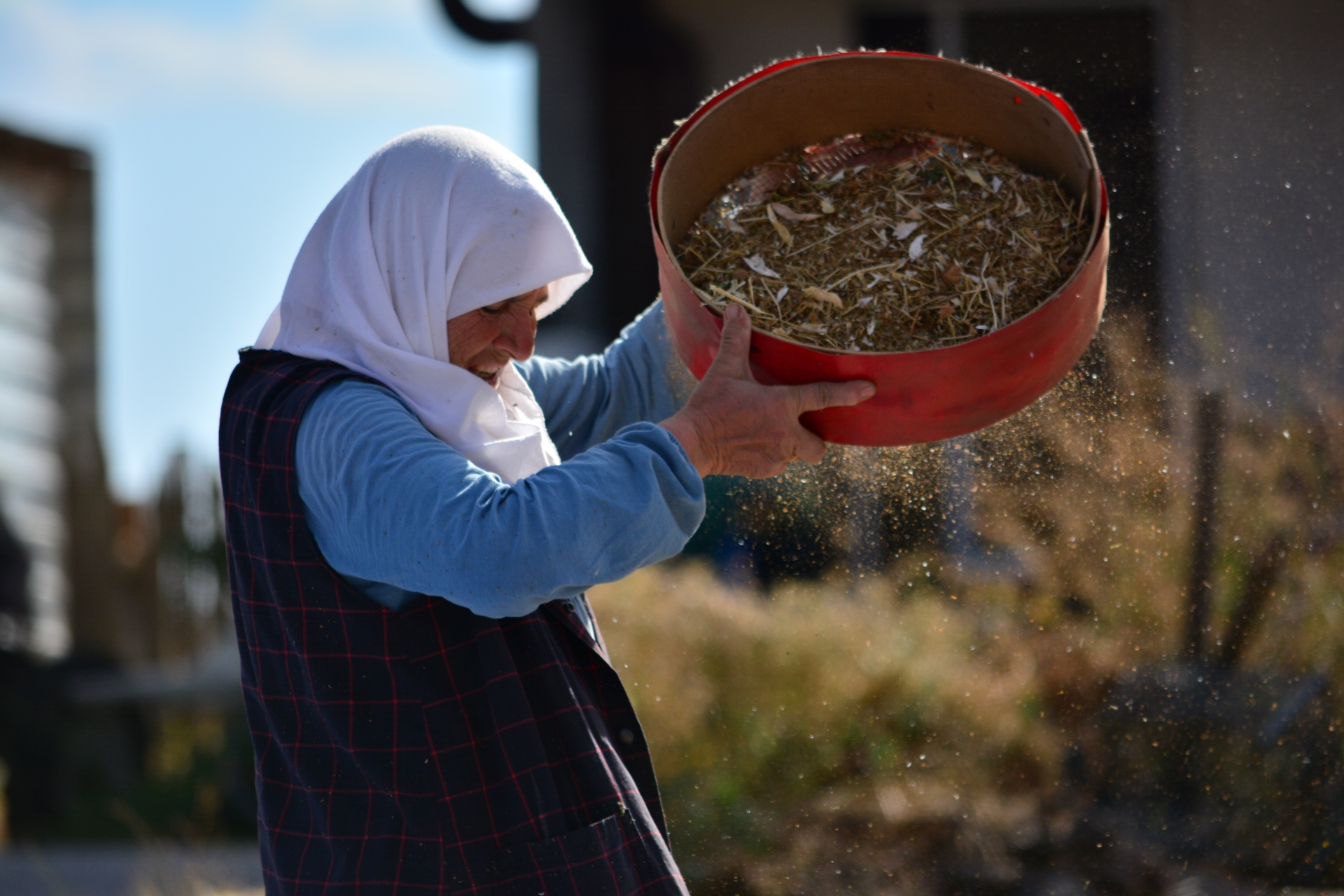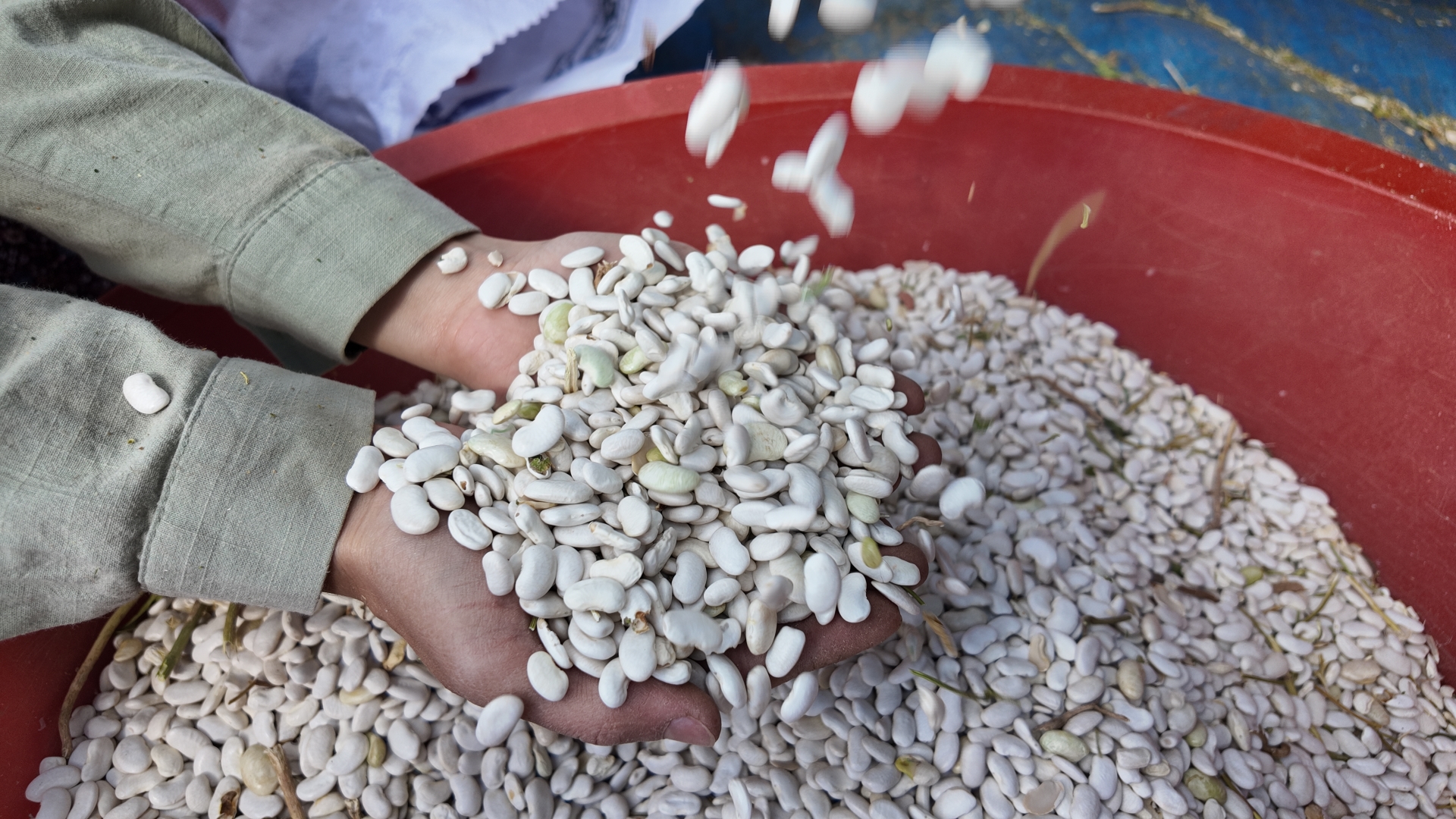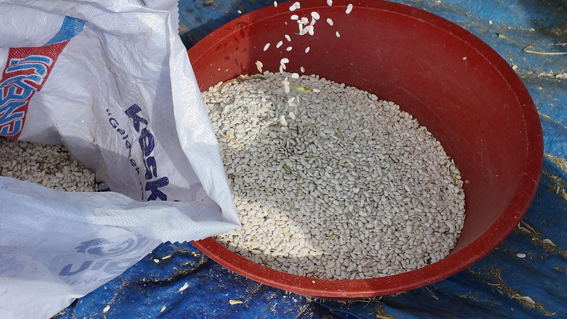 Yere serilen bez üzerinde küspesi ile biriken kuru fasulyeler tozundan ve küspesinden arındırılması için rüzgârda yelleme yapılırken, el eleği de ile eleme yapılarak temizleniyor.