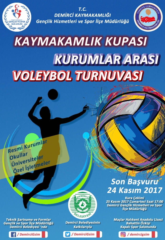 Demirci Belediyesinin katkıları ile Gençlik Hizmetleri ve Spor İlçe Müdürlüğü tarafından düzenlenecek olan voleybol turnuvası için başvurular başladı. 14 Kasım 2017 Salı günü başlayan turnuva başvuruları, 24 Kasım 2017 Cuma gününe kadar devam edecek.