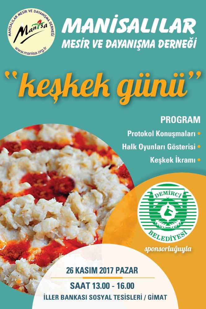 Manisalılar Mesir ve Dayanışma Derneğince, Demirci Belediyesinin sponsorluğunda " Keşkek Günü " düzenleniyor.