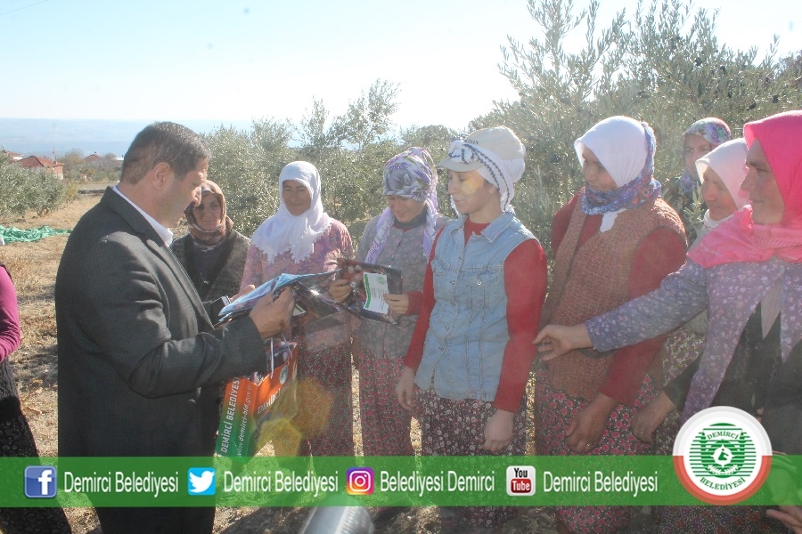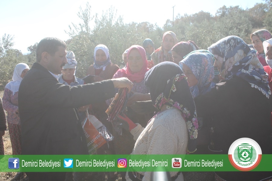 Başkan Selami Selçuk daha sonra tarlada zeytin hasatı yapan bayanlara eşarp ve erkeklere de tişört hediye ederek, kolaylıklar diledi.