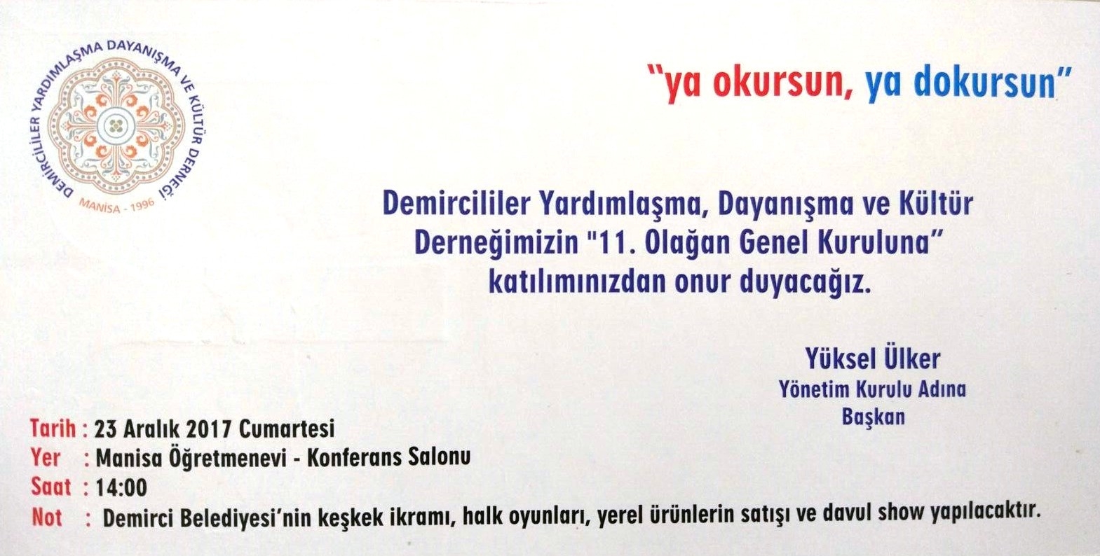 Manisa Demircililer Yardımlaşma Dayanışma ve Kültür Derneği olağan genel kurulunda Demircililer bir araya geliyor.