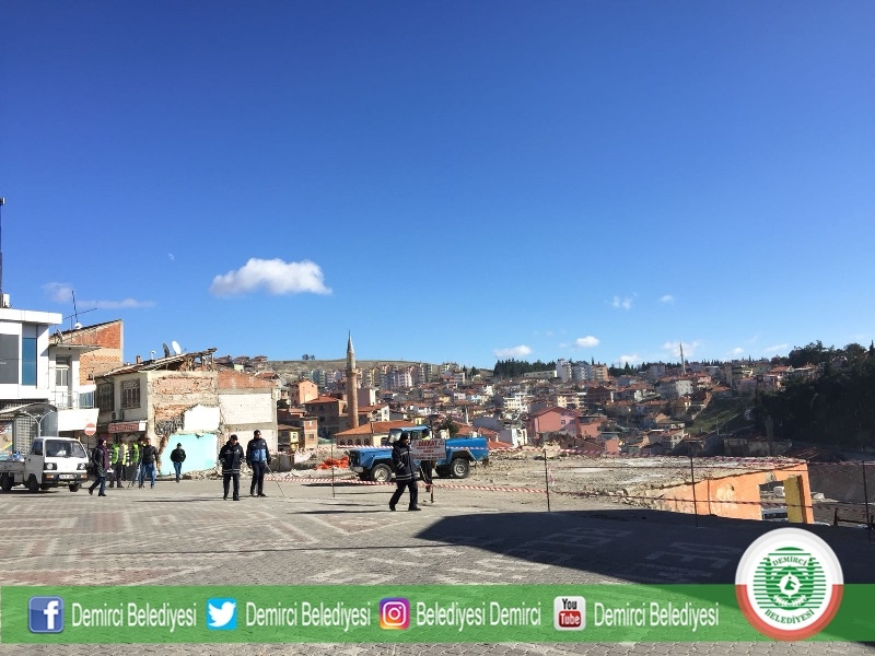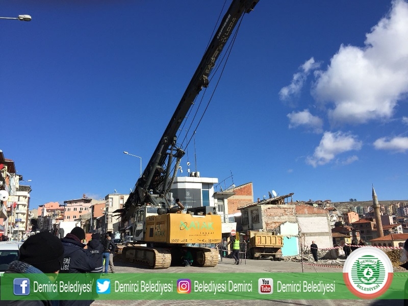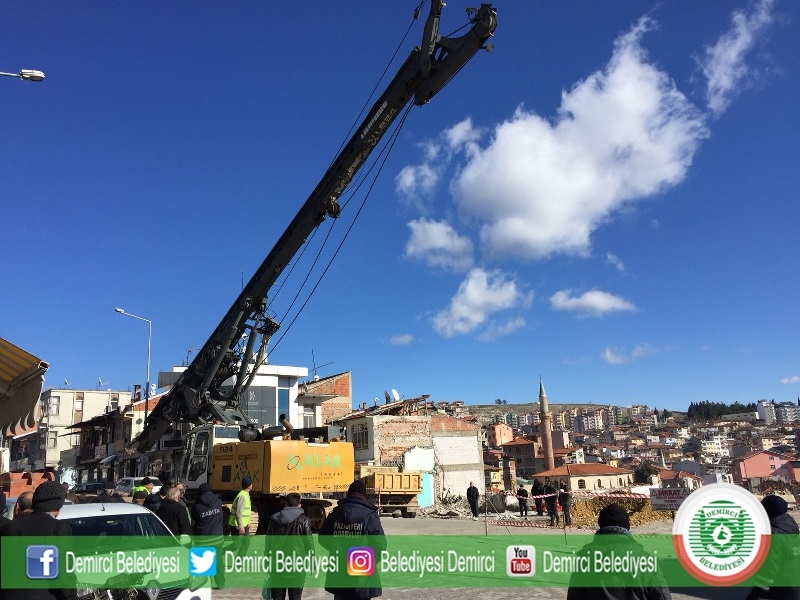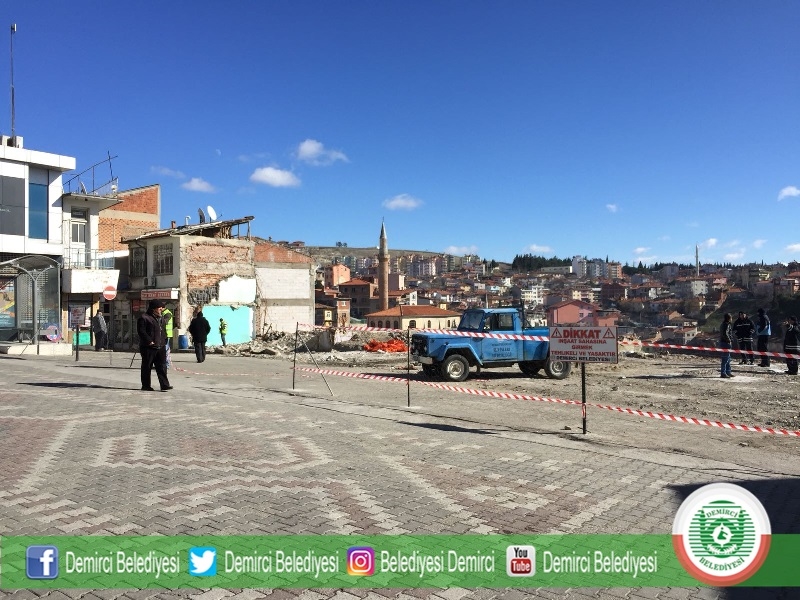 Mülkiyeti Demirci Belediyesine ait İlçemiz Cumhuriyet meydanında bulunan binaların bulunduğu alana yapılacak olan yeni kent merkezi projesinin uygulanması için eski binaların yol üstünde bulunan kısımlarında binaların yıkımı tamamlandı.