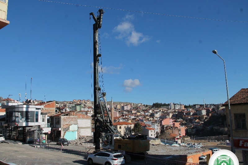 Kalan binanın yıkımı ve yapılacak olan yeni binanın temel kazısı yapılmadan önce ana cadde üzerinde, zemine delgi makinesinin burgulu sondası ile 77 adet delik açılacak. Açılacak olan delikler içerisine demir donatılar yerleştirilip sonrasında beton dökülerek 17 ve 22 m boylarında olacak olan betonarme kazıkların imalatları tamamlanacak. Bu uygulama ile 11 metrelik kot farkından doğacak olan herhangi bir şev kayması engellenecek ve yeni binanın yapımı esnasında güvenli bir çalışma alanı sağlanacaktır.