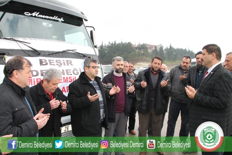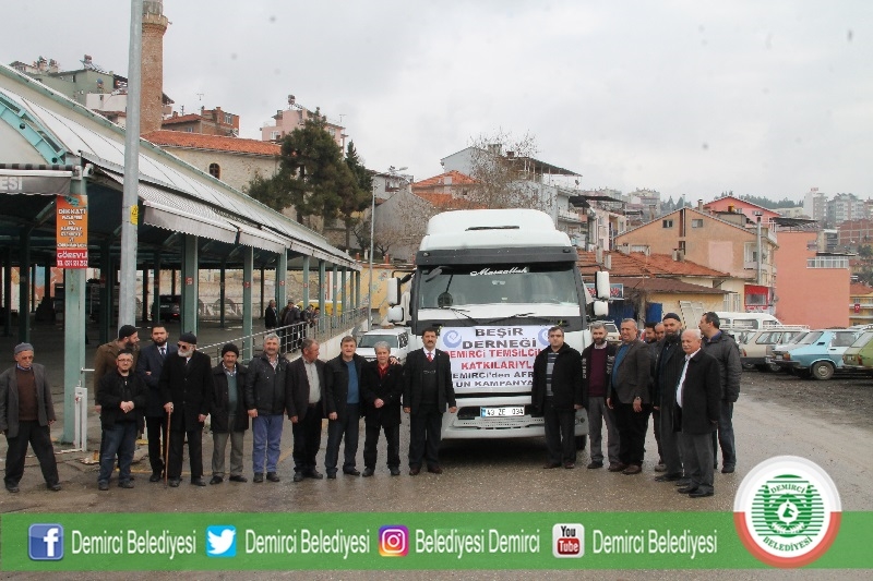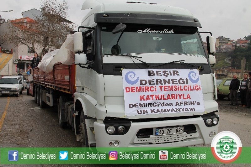 Demirci Beşir Derneği tarafından başlatılan kampanya ile Demirci Belediyesi ve vatandaşların desteği ile " Zeytin Dalı Harekatında " bulunan güvenlik güçlerine ekmek ve yiyecek desteği için ilçede toplanan 500 çuval un tıra yüklendi.