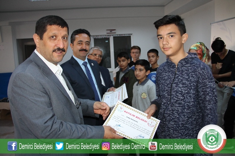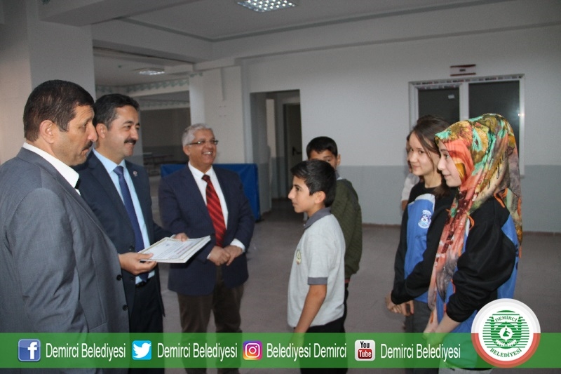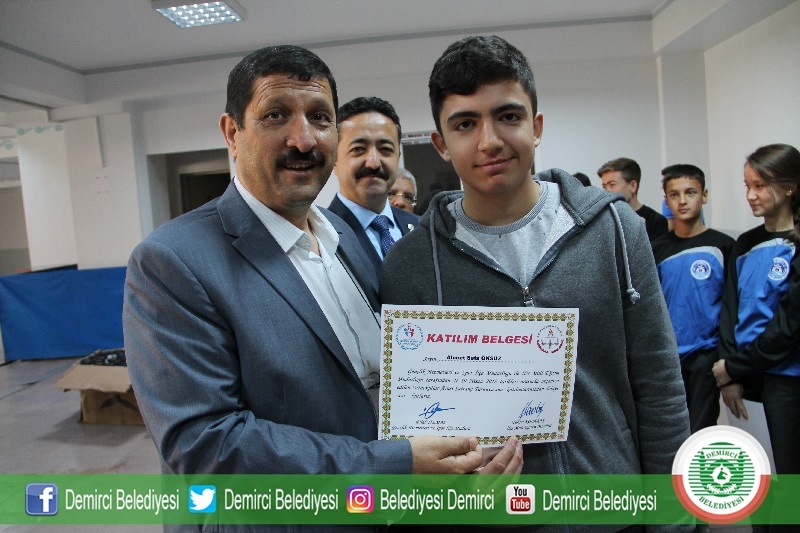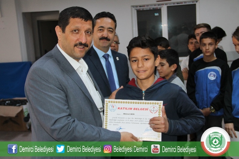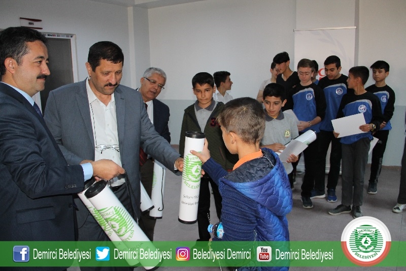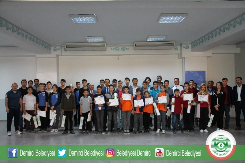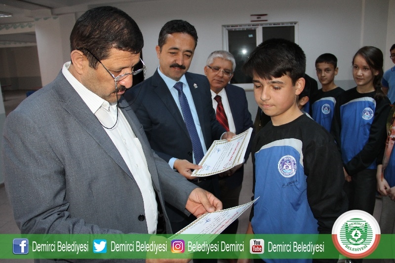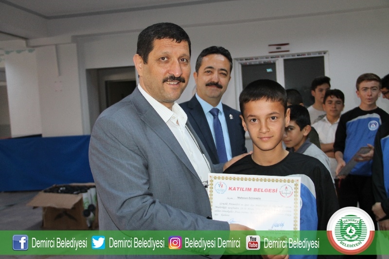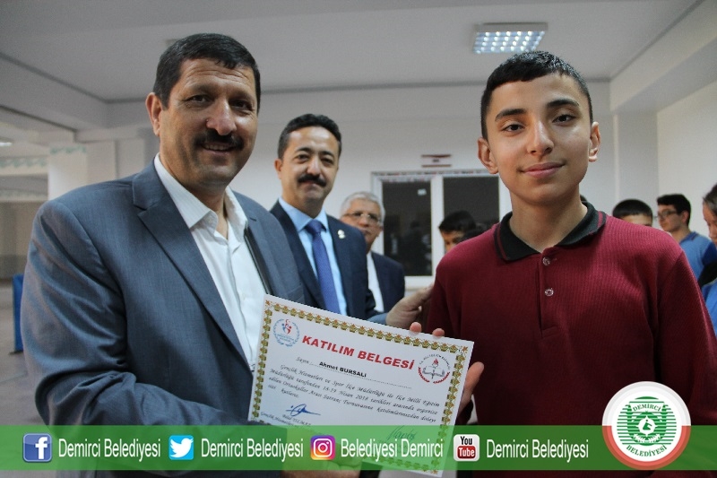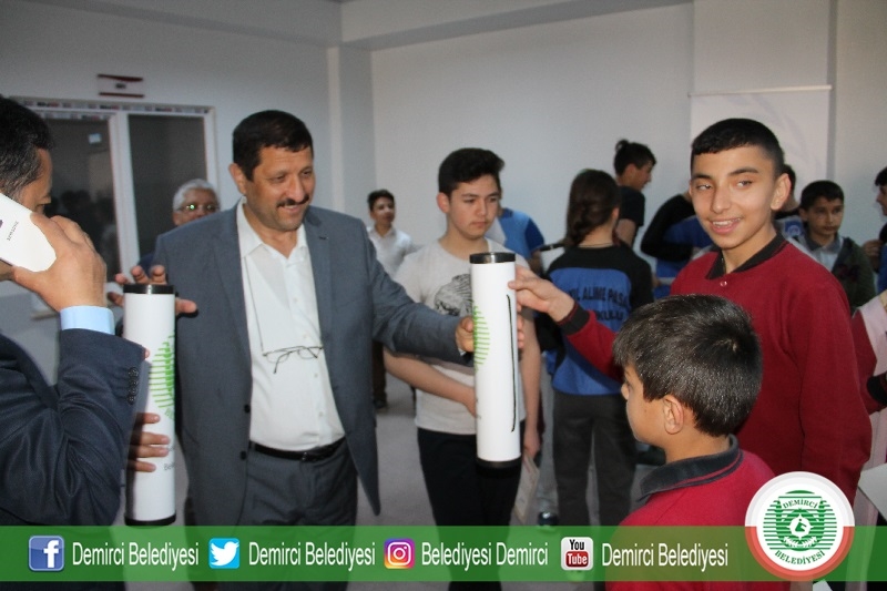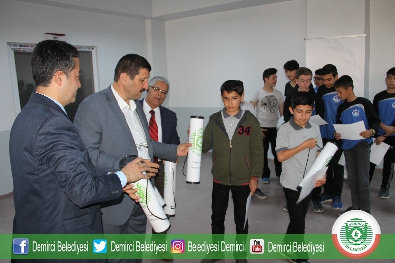 Başkan Selami Selçuk, satranç turnuvasına katılan öğrencilere Demirci Belediyesi logolu satranç takımı hediye etti.