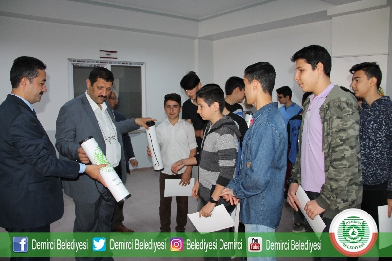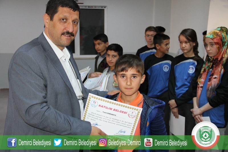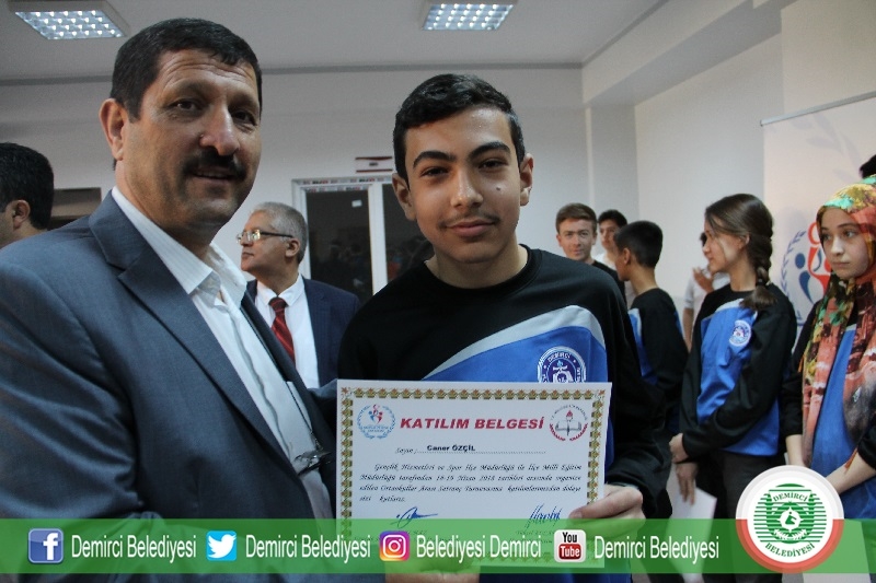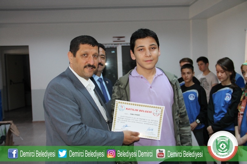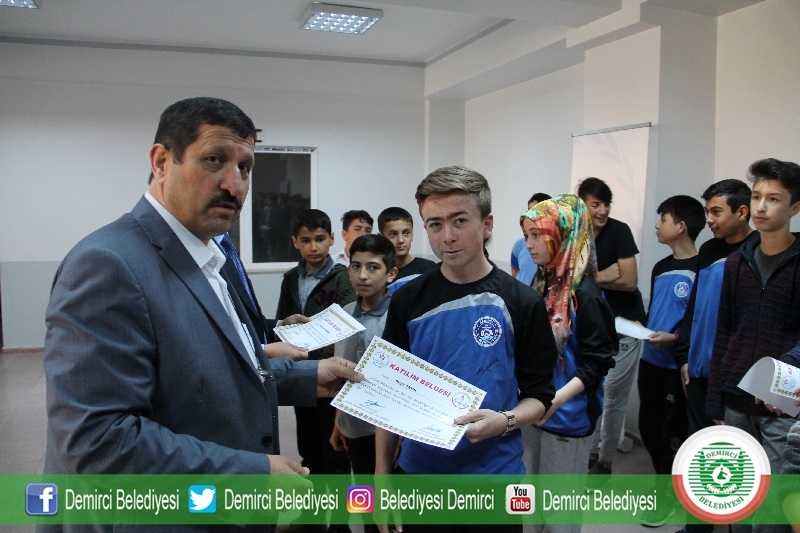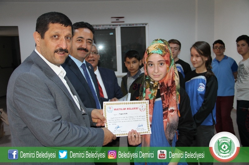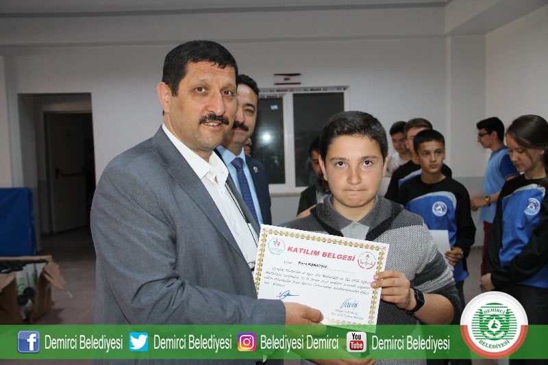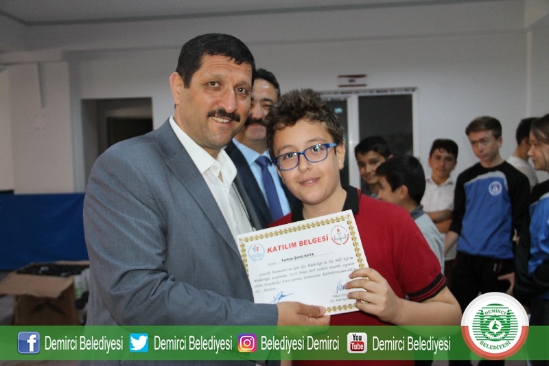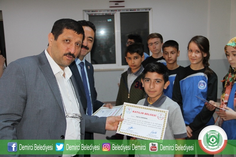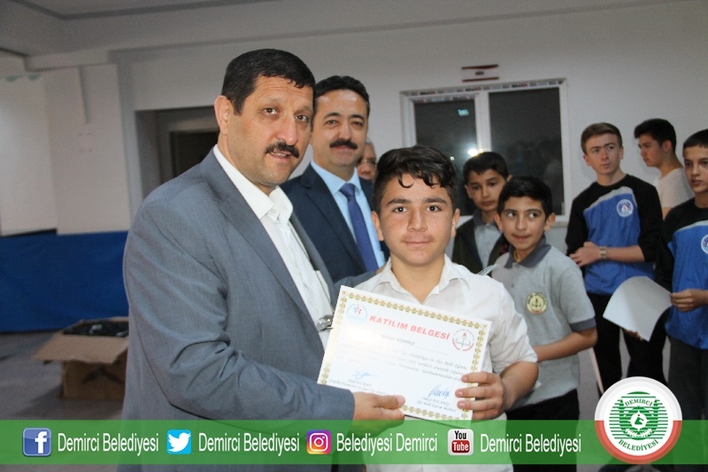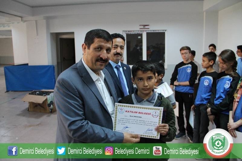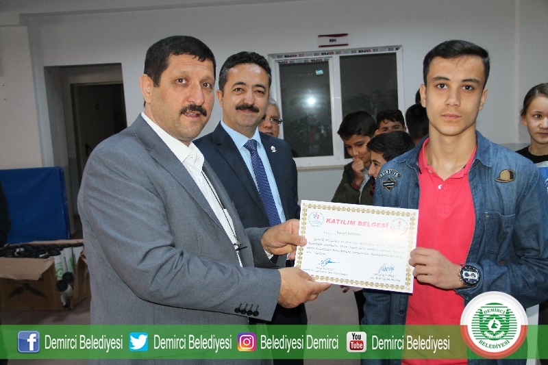 Başkan Selami Selçuk, satranç turnuvasına katılan öğrencilere Demirci Belediyesi logolu satranç takımı hediye etti.