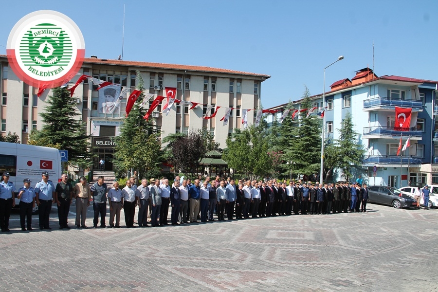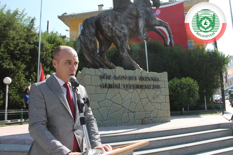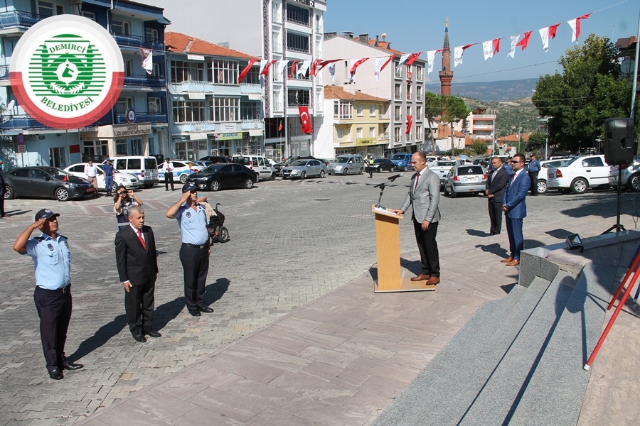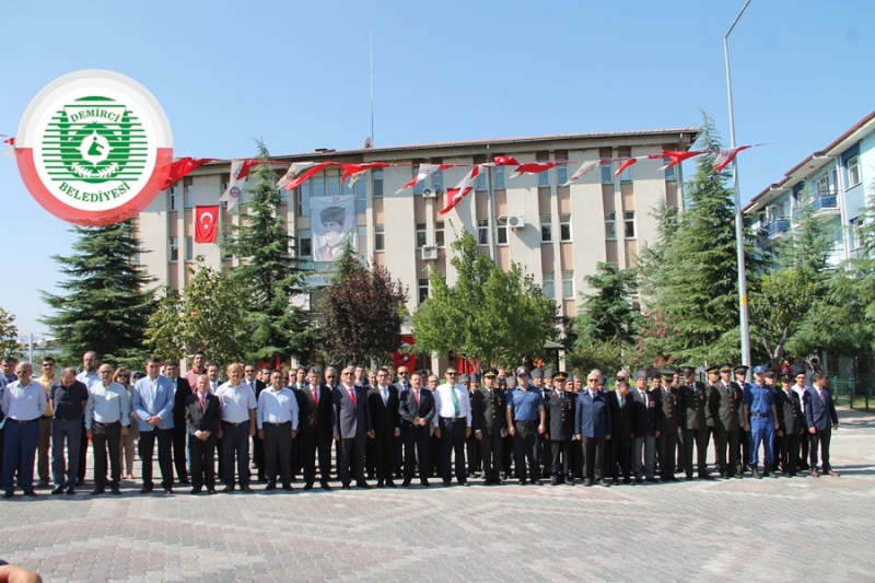 Demirci Belediyesi hizmet binası önünde bulunan Atatürk Anıtı önünde düzenlenen 30 Ağustos Zafer Bayramı törenine Demirci Kaymakamı Mutlu Akyol, Belediye Başkanı Selami Selçuk, daire amirleri, gaziler ve ilçe halkı katıldı.