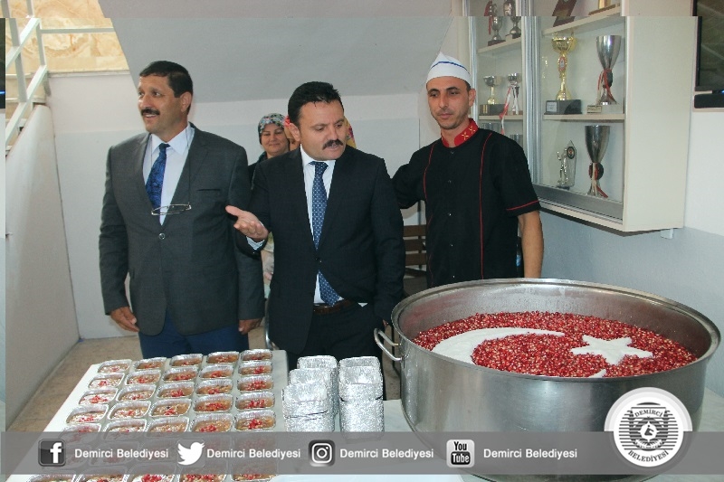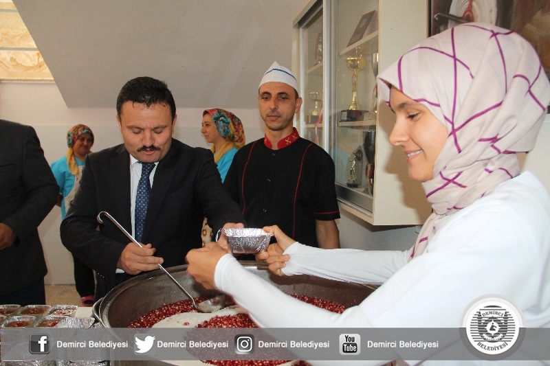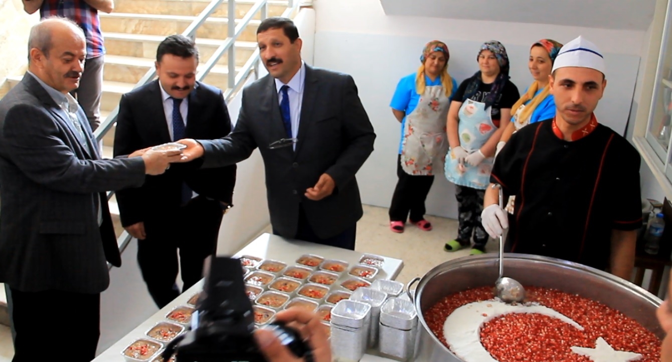 Kaymakam Mutlu Akyol ve Belediye Başkanı Selami Selçuk, açılışın ardından okul içerisinde kurulan aşure kazanında katılımcılara aşure ikramında bulundular.