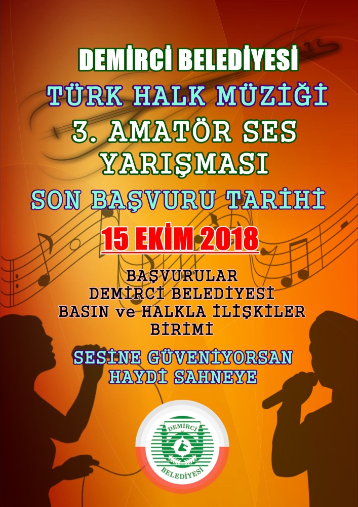 Türk Halk Müziği Amatör ses yarışmasına katılmak isteyenlerin 15 Ekim 2018 Pazartesi günü mesai bitimine kadar Demirci Belediyesi Basın ve Halkla İlişkiler birimine başvurularını şahsen yapabilirler.