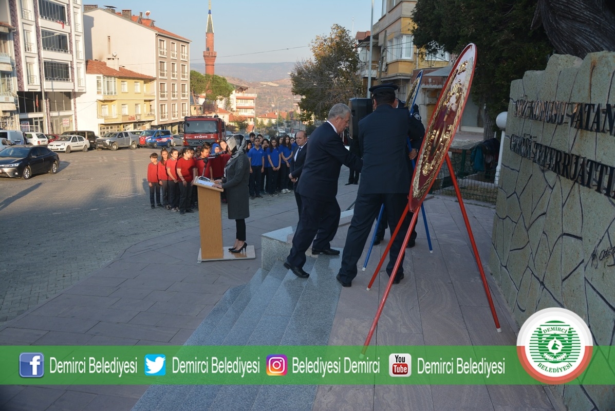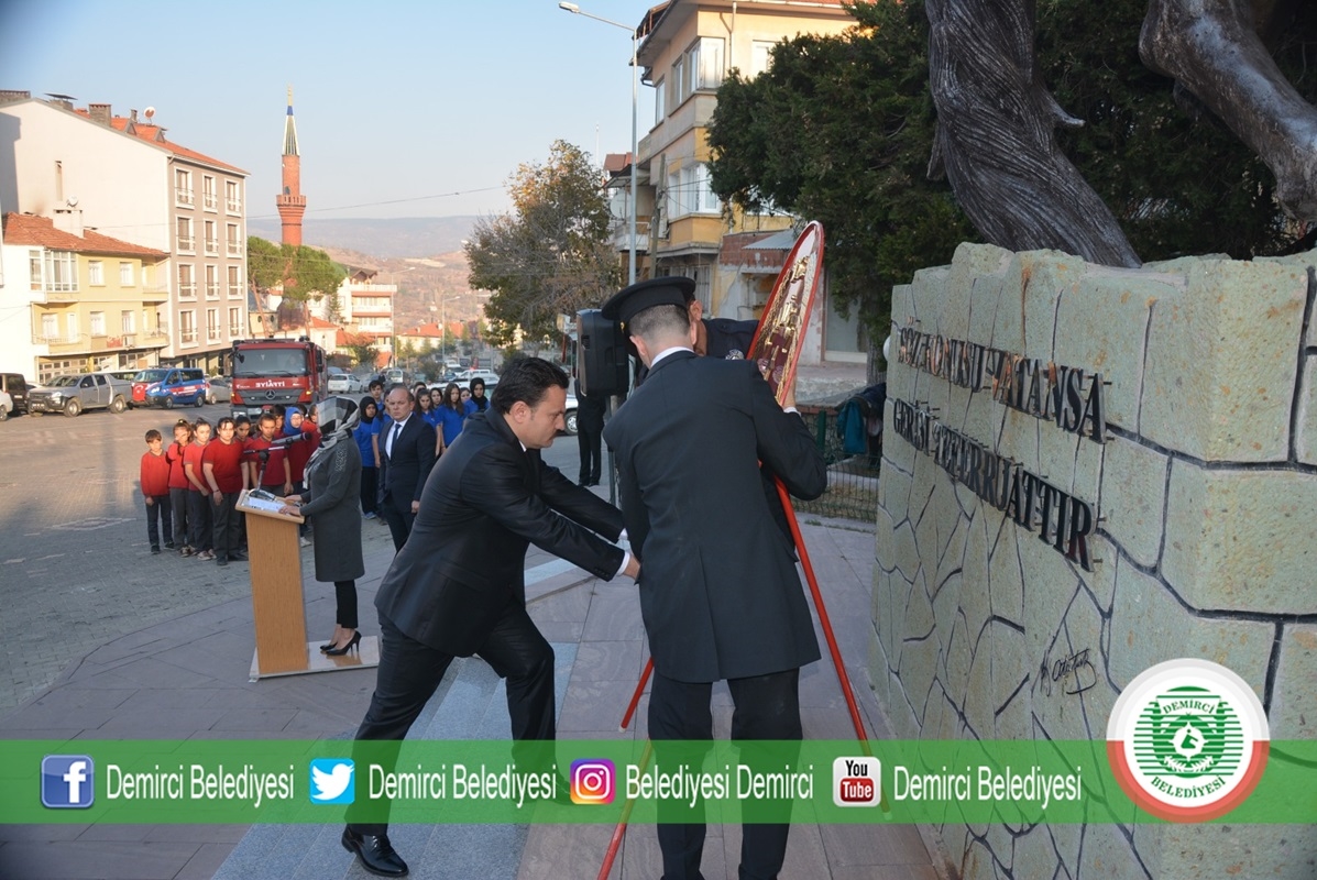 Törende Demirci Kaymakamı Mutlu Akyol ve Belediye Başkan V. Mustafa Ünlü ve Cumhuriyet Halk Partisi tarafından anıta çelenk sunumu yapılırken, 2 dakikalık saygı duruşu ve akabinde İstiklal Marşı okundu.