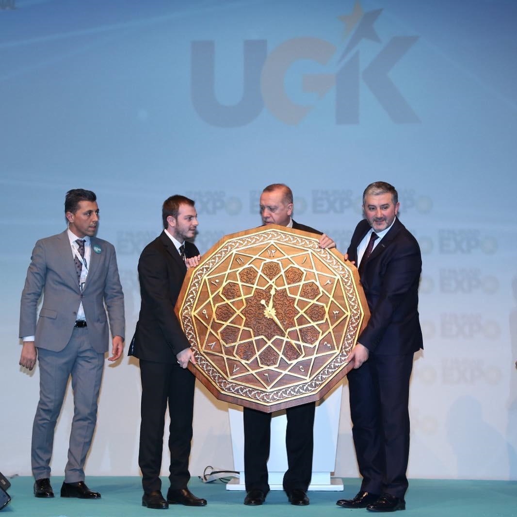 Müstakil Sanayici ve İşadamları Derneği (MÜSİAD) tarafından CNR Expo'da düzenlenen 17. MÜSİAD EXPO Kapanış ve Uluslararası Genç İşadamları Kongresi (UGİK) Açılış Töreninde Demirci’de bir firma tarafından yapılan Ahşap Oyma saat Cumhurbaşkanı Recep Tayyip Erdoğan’a takdim edildi.