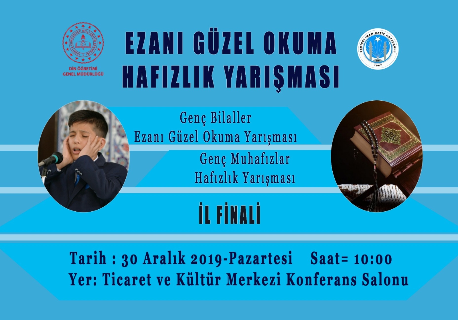 30 Aralık Pazartesi günü saat : 10:00'da Ticaret ve Kültür Merkezi Konferans salonunda yapılacak olan ezan okuma ve hafızlık yarışmasında 17 İlçe'nin İmam Hatip Ortaokulları katılacak.