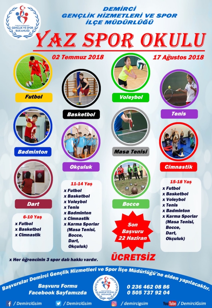 Turgut Özal Spor Kompleksinde yapılacak olan yaz spor okulu başvuruda bulunmak isteyenler, başvuru formu, 1 adet fotoğraf ve Nüfus Cüzdanı Fotokopisi ile Demirci Gençlik Hizmetleri ve Spor İlçe Müdürlüğüne elden teslim edilecektir.