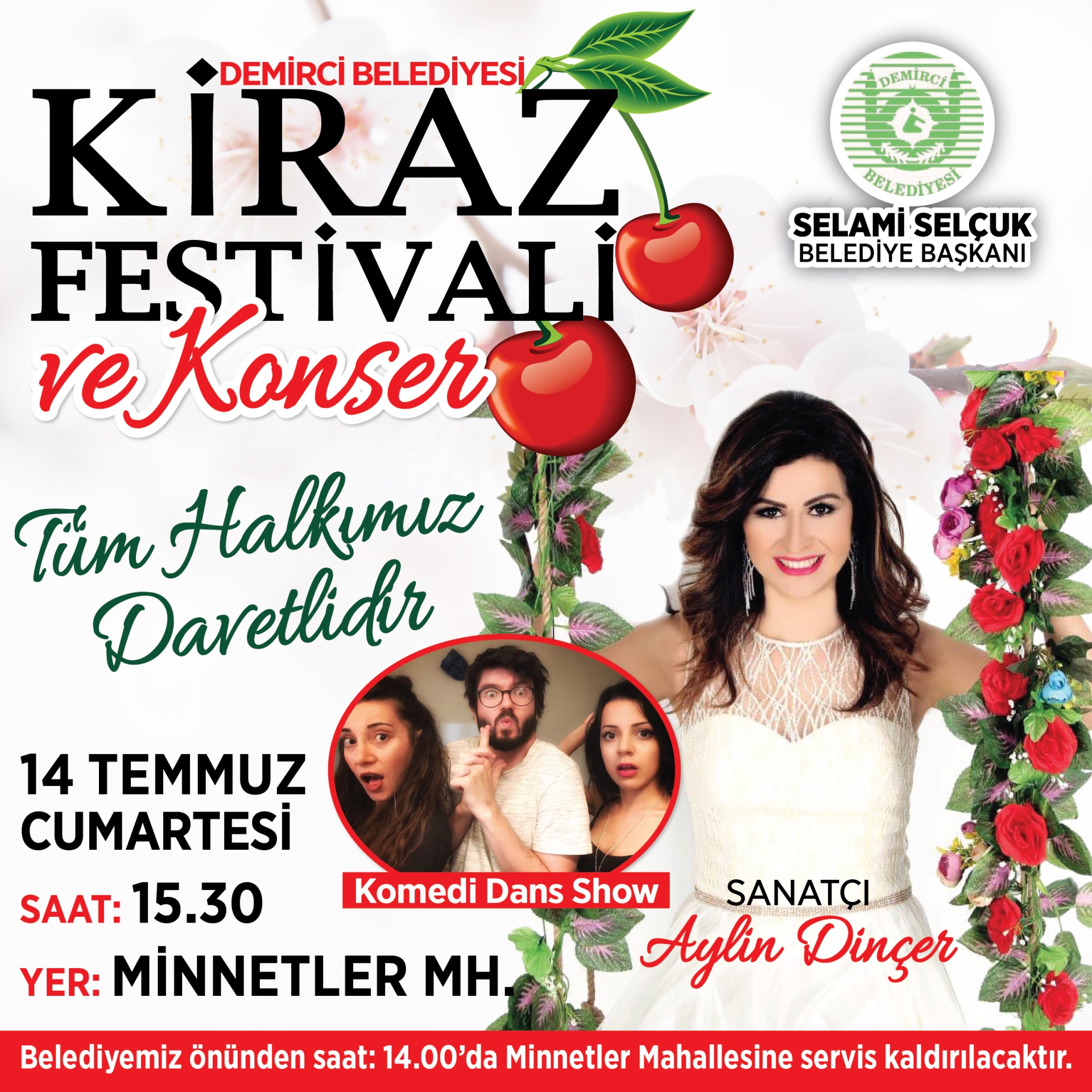 Minnetler Mahallesinde yapılacak olan kiraz festivali için 14 Temmuz Cumartesi günü belediyemiz hizmet binası önünden saat 13:30'da servis kaldırılacak.