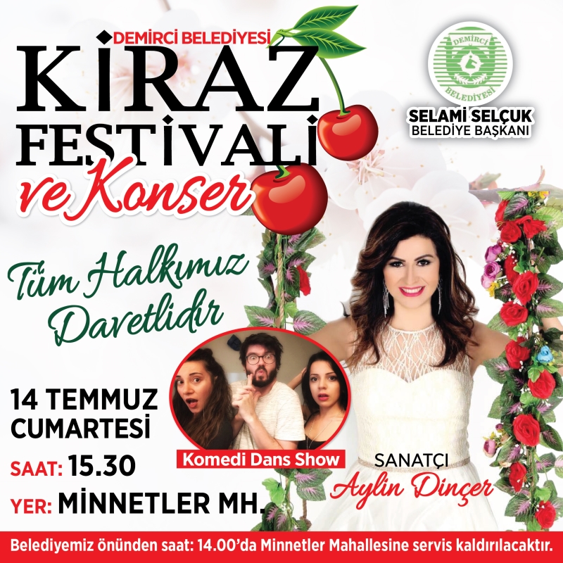 Kiraz Festivalinde dereceye giren kirazların üreticileri Altınla ödüllendirilirken, ayrıca Komedi Dans Üçlüsü ve sanatçı Ankaralı Aylin Dinçer'de birbirinden güzel türküler ile katılımcıları coşturacak.