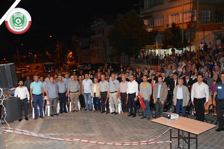 Demirci ilçesinde 15 Temmuz Şehitleri Anma Demokrasi ve Milli Birlik günü etkinlikleri çerçevesinde Çereşe meydanından Belediye hizmet binası önüne yürüyüş yapılırken, Belediye hizmet binası önünde program gerçekleşti.