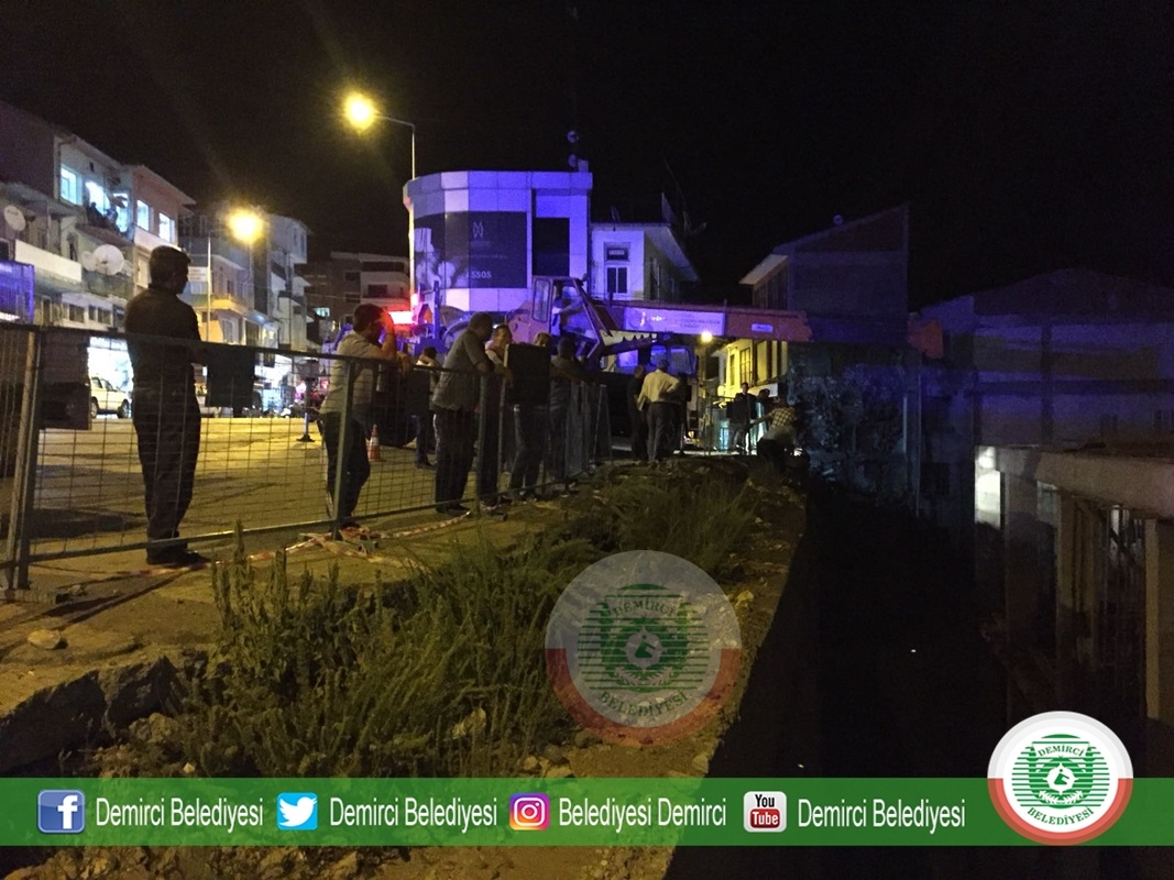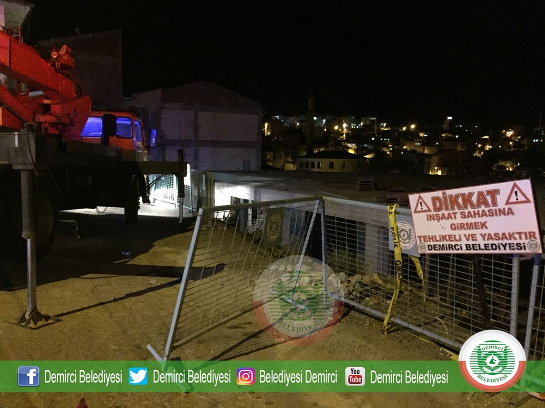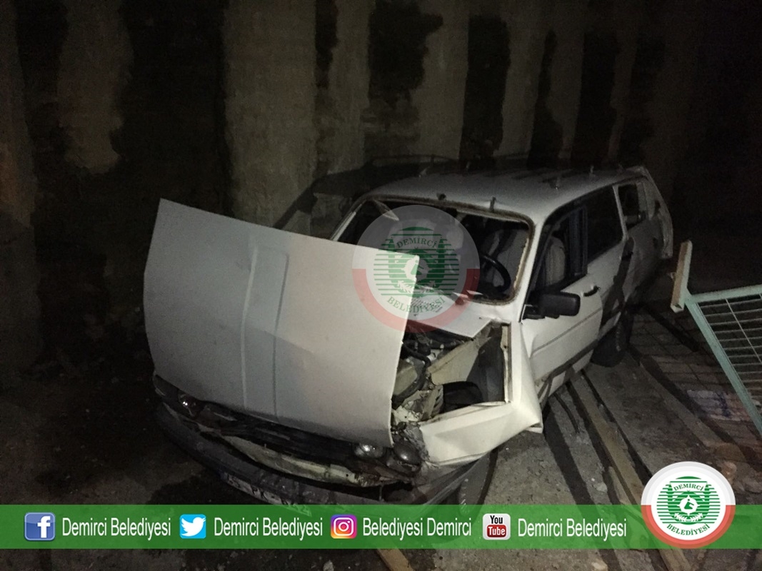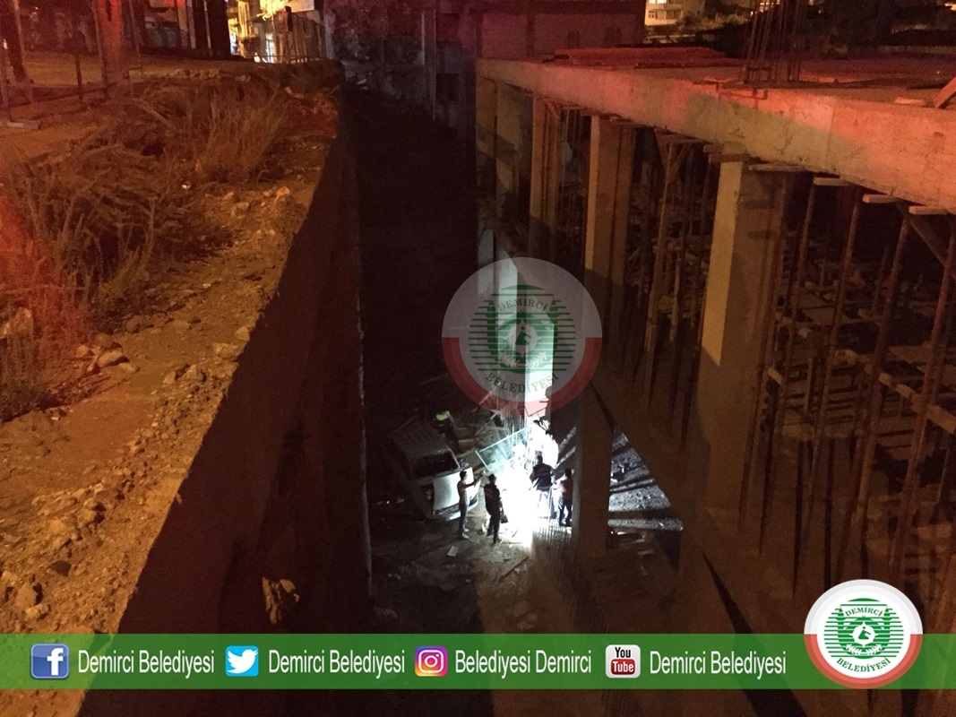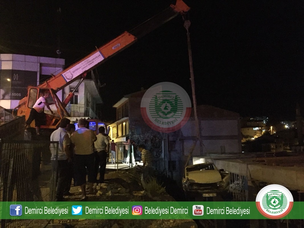 İnşaat boşluğuna düşen otomobil Demirci Şoförler ve Otomobilciler odasının vinçi ile Zabıta ekiplerinin yardımı ile çıkarılarak, çekiciye yüklendi.